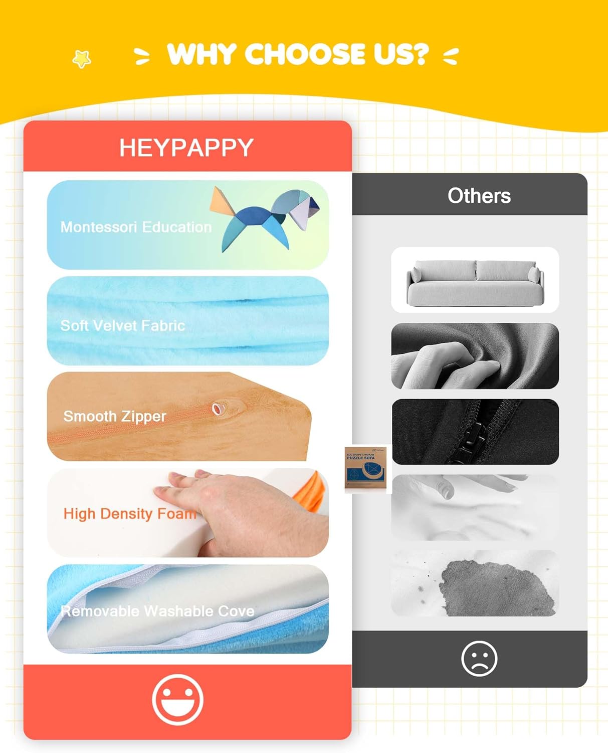 - Endless Configurations: Heypappy kids play couch's modular design allows children to experiment with 1600+patterns, fostering cognitive skills and problem-solving abilities while experiencing a 100% improvement in hands-on capabilities and intellectual growth. Children can create different forms and shapes to experience the endless adventures they desire, and easily stack and store them after playtime. Transform playtime into a learning adventure!