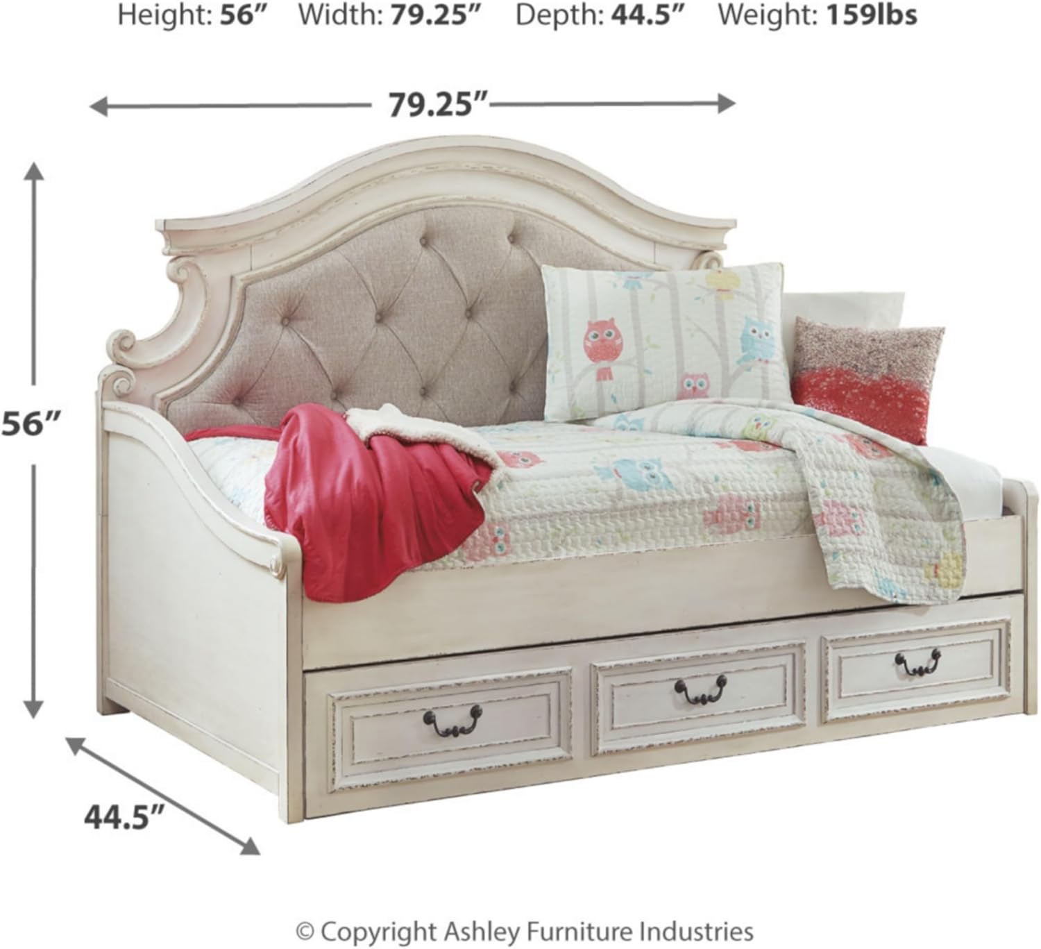 - DIMENSIONS: Measures 79.25" W x 44.5" D x 56" H. Includes day bed and under bed storage unit. Bed does not require additional foundation/box spring. Mattress available, sold separately
