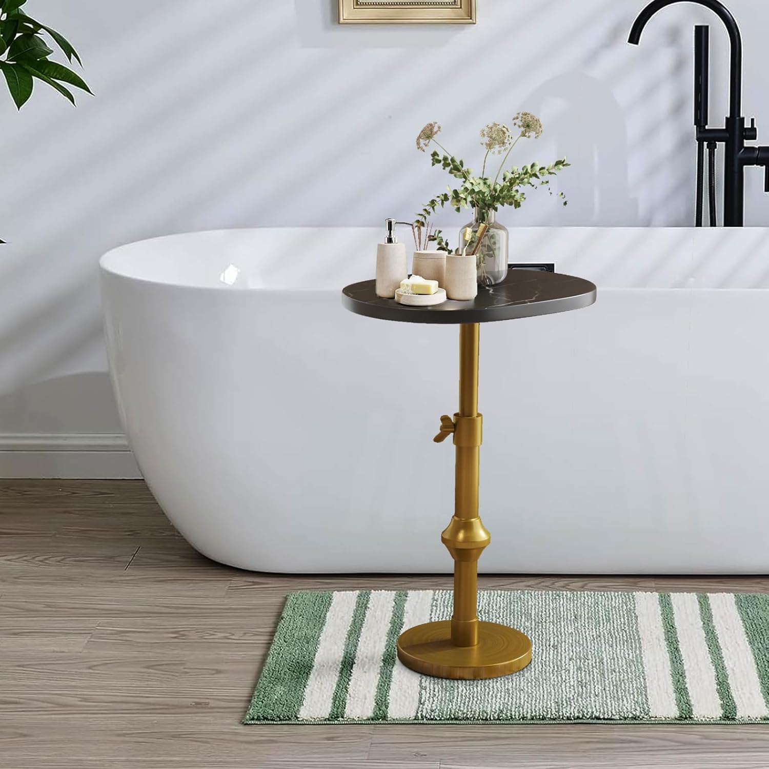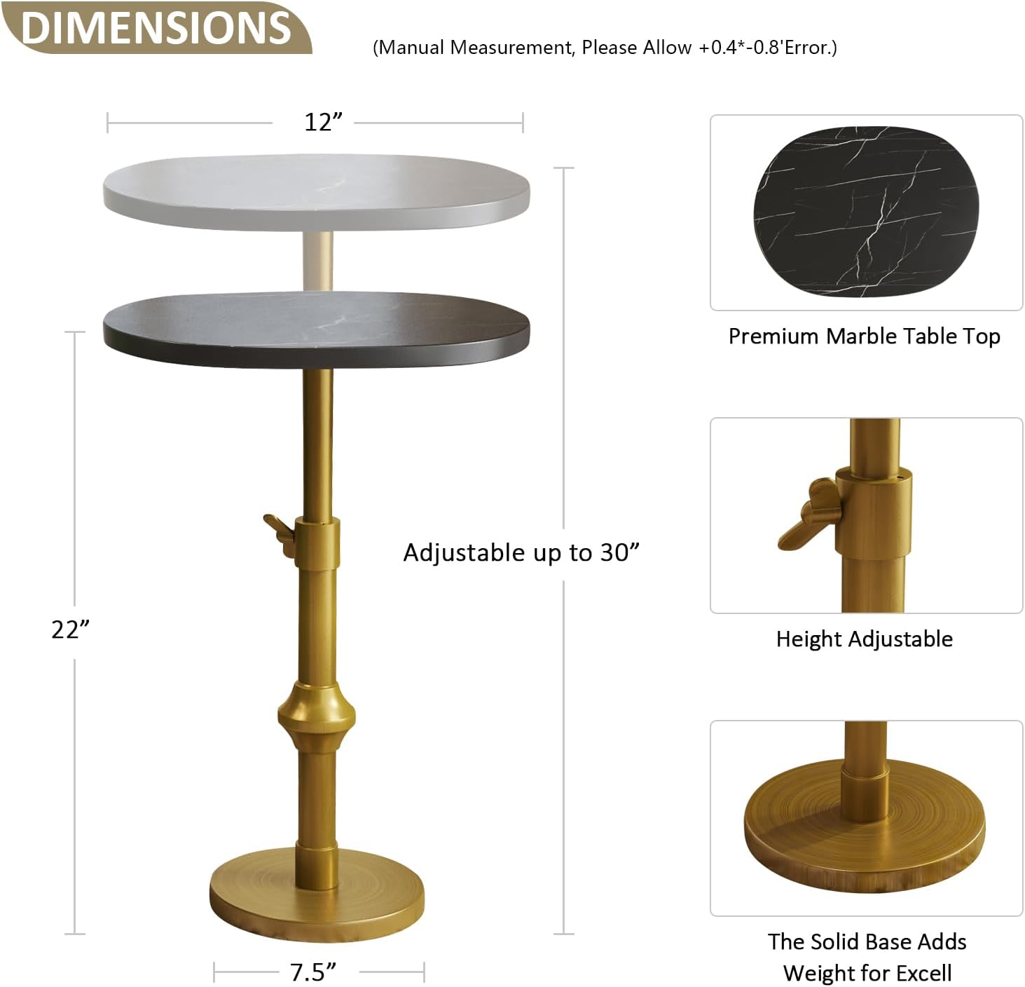 Marble Drink Table, 10"x12"x(22“~30") Martini Table with Metal Antique Brass Adjustable Stand Base, Drink Tables for Small Spaces, Living Room, Bedroom, Or Office (Black)