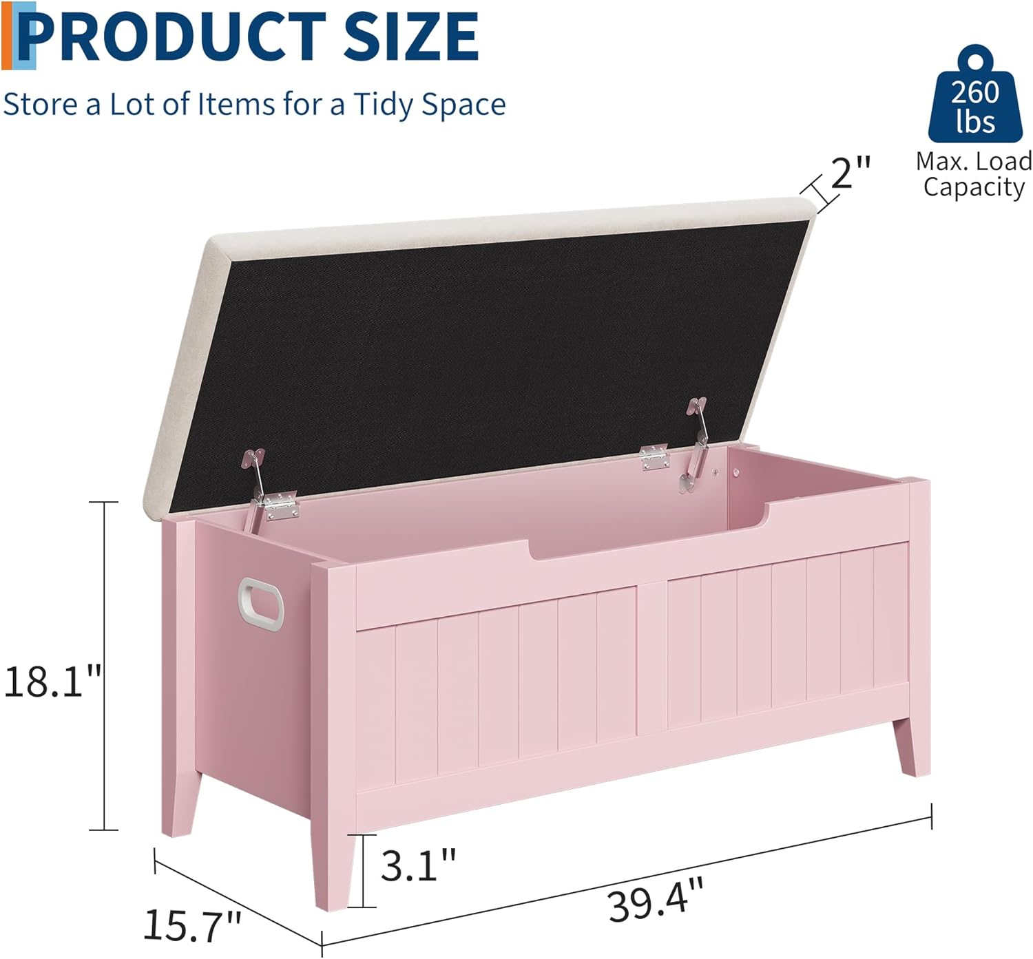 - Durable Build: Engineered for strength with high-quality particle board and reinforced 15mm thick walls, supporting up to 260 lbs. The soft padded top adds comfortable seating and elegant style