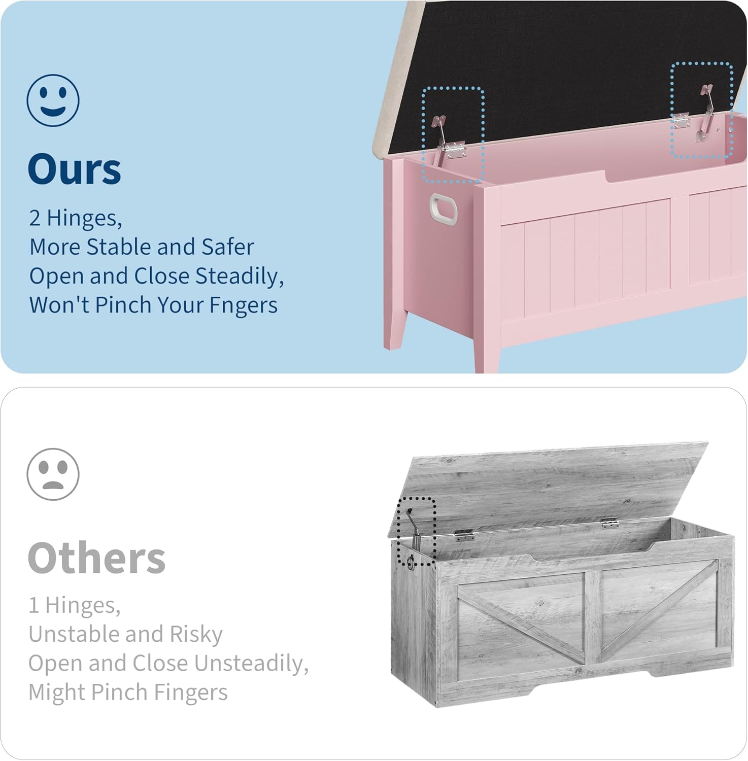 - Enhanced Safety Hinges: Features 2 built-in safety hinges to prevent the lid from slamming shut, protecting fingers. The convenient front cut-out allows for easy one-handed opening