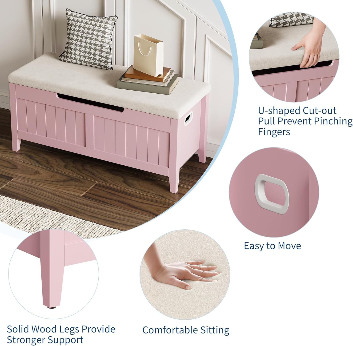 - Ergonomic Side Handles: Wide, comfortable cut-out side handles make it effortless to relocate this versatile bench wherever you need extra storage or seating – bedrooms, entryways, or living rooms
