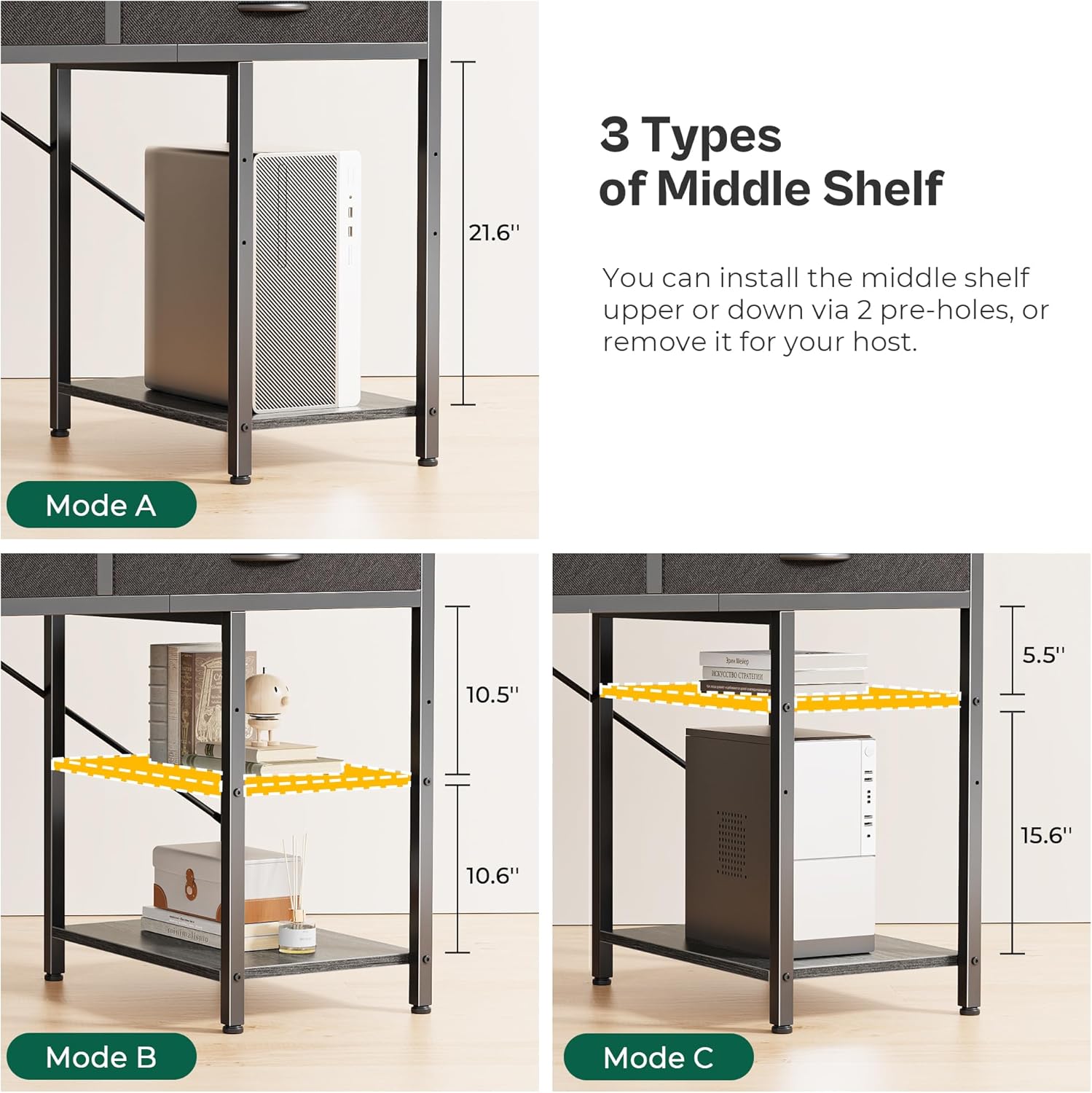 - 【Reversible Design & Adjustable Shelf】You can choose to install the fabric drawers on either the left or right side, making this writing desk adaptable to your space. With 2-level pre-drilled holes for the middle shelf, you can adjust its height to hold tall or short items or remove it entirely to accommodate your host. This flexibility allows you to create a work space that’s perfect for your needs
