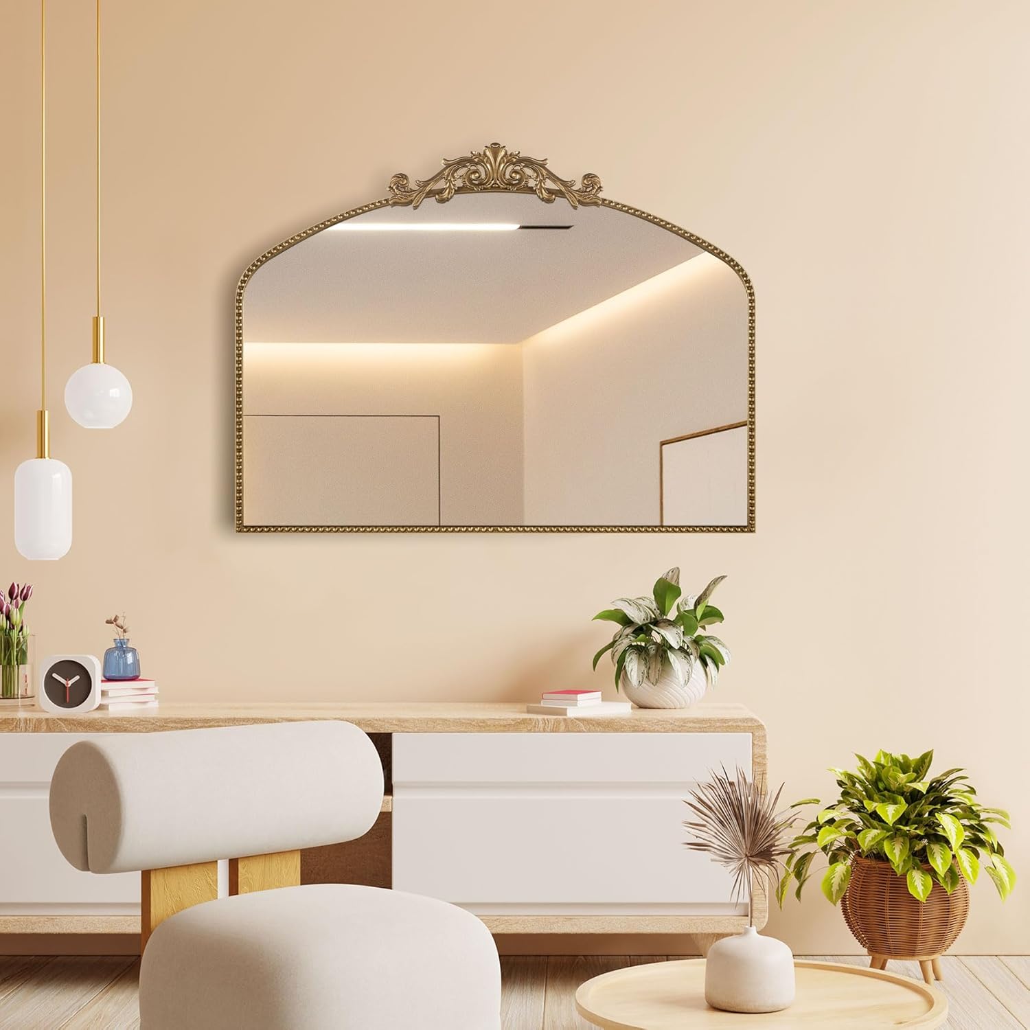 Large Ornate Gold Antique Mirror 40” x 30”, Vintage Wall Mirror with Gold Beaded Arch Frame, Dresser Mirror for Dining Room,Living Room, Sofa Wall, or Hallway Decor