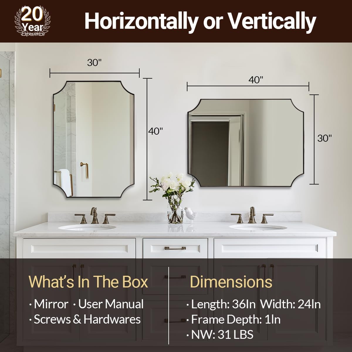 - 【Premium Stainless Steel Craftsmanship】: (N.W: 31LBS). Crafted from stainless steel metal with oxidation-resistant properties, this brushed bronze bathroom mirror offers enhanced stability and a longer lifespan