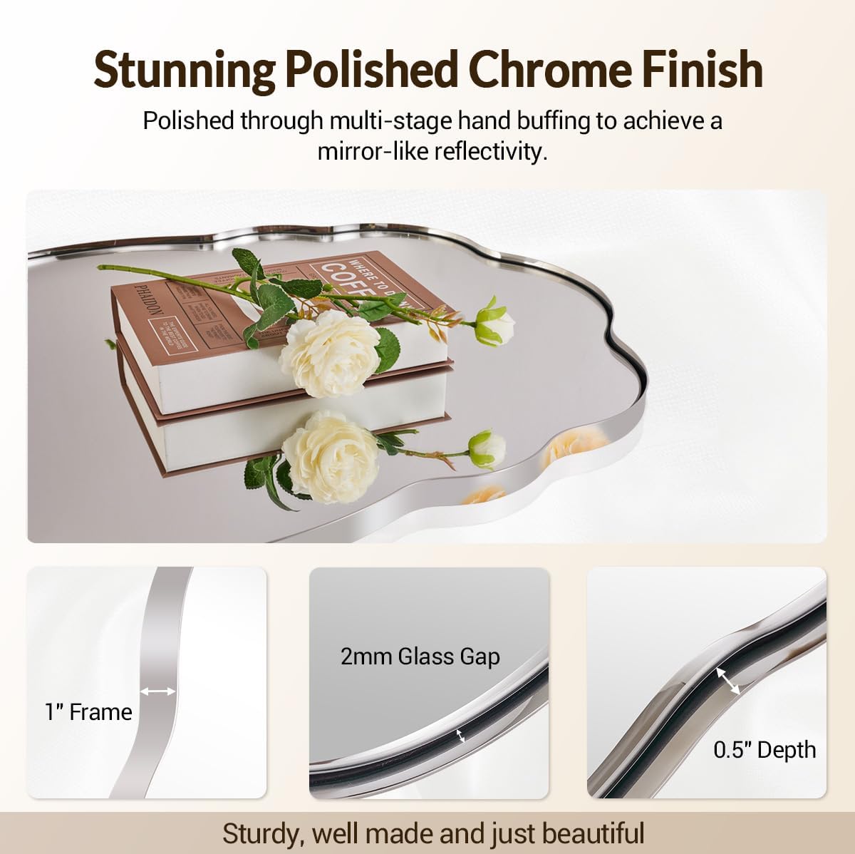 - SOPHISTICATED CURVED DESIGN: Featuring mesmerizing asymmetry and artfully irregular contours, this chrome oval vanity mirror is a true masterpiece. Designed to harmonize with any interior—be it modern, minimalist, farmhouse, or eclectic—this oval vanity mirror elevates your space with distinctive charm and artistic flair