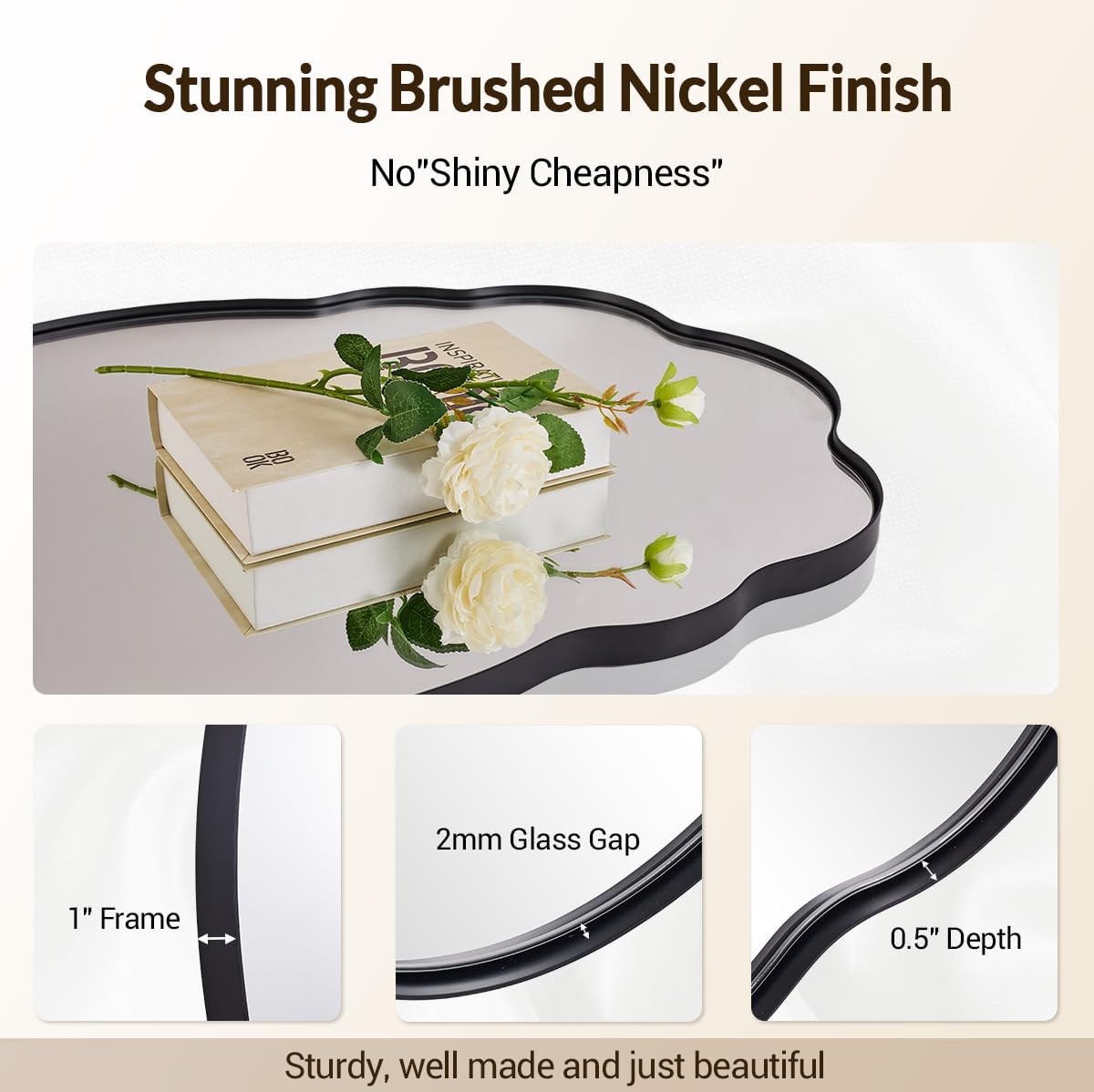 - HIGH - DEFINITION CLARITY: The 24x36" black vanity mirror uses digital display grade silver glass that provides excellent reflection and lighting for your space. Unlike tempered glass, scalloped wall mirror guarantees high definition without any distortion, offering true - to - life images