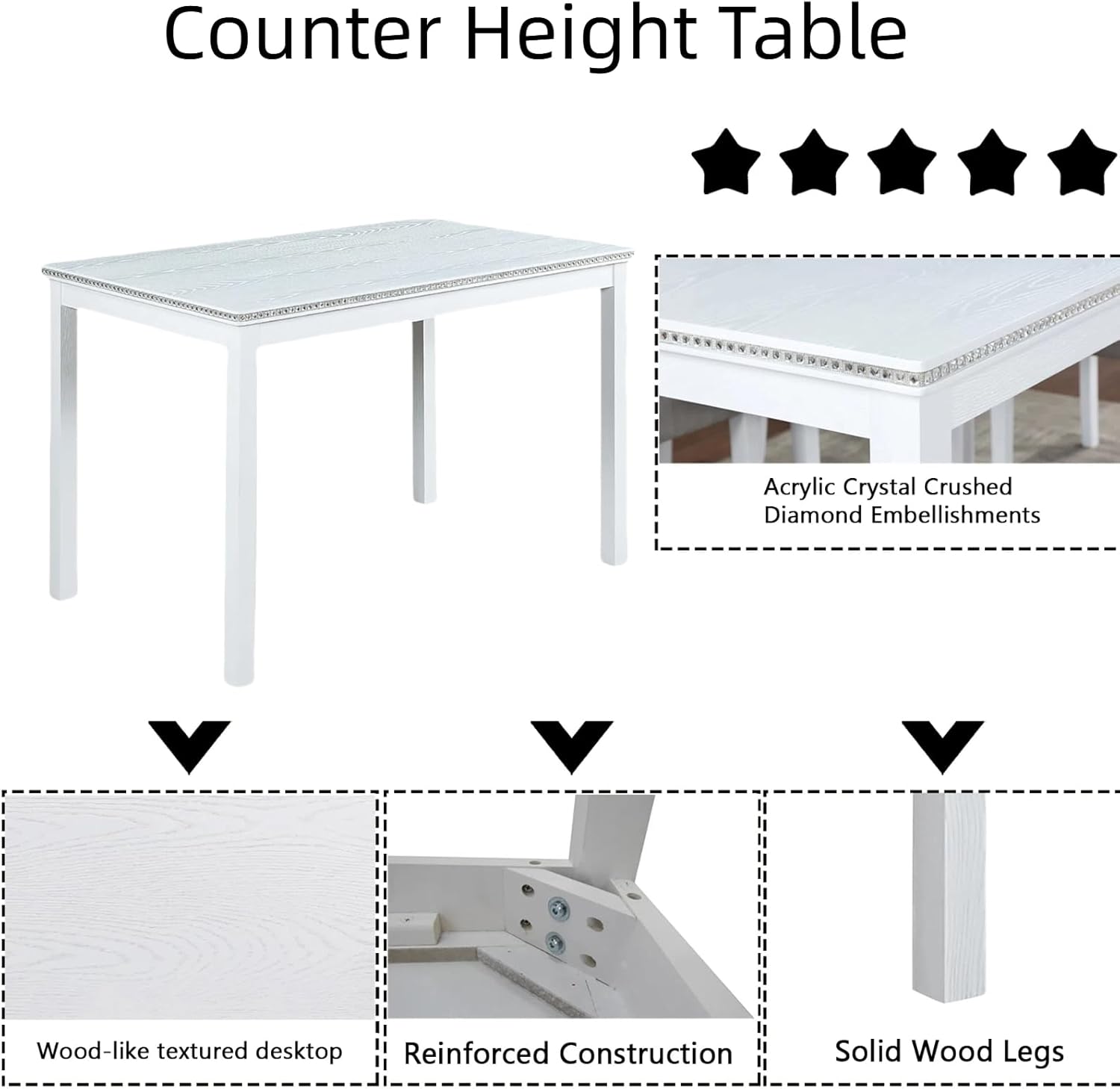 - Elegant Crystal-Accented Design:This counter-height set features a 34.5" square table with sparkling acrylic crystal embellishments along the edges, blending modern clean lines with subtle glamour. The 36" height creates an elevated dining experience