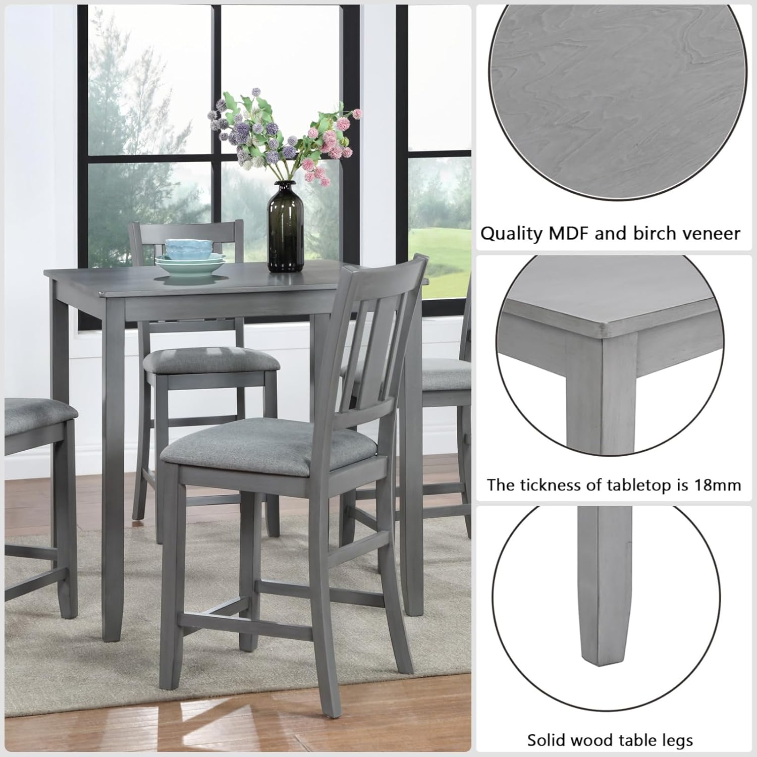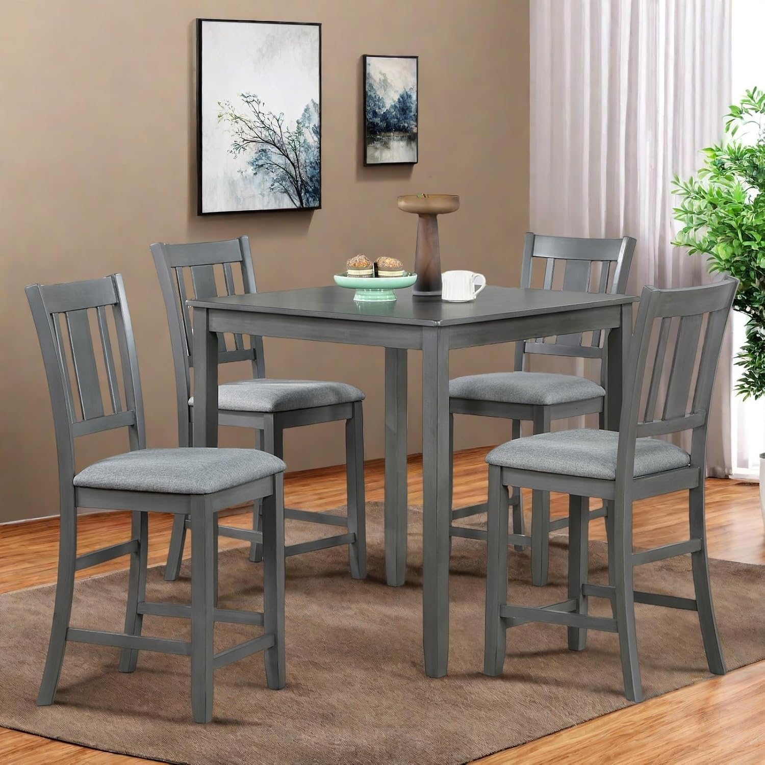 Dining Table Set for 4, Modern 5 Piece Dining Room Table Set with Square Table & 4 Slatted Backrest Upholstered Chairs, Counter Height Kitchen Chairs Set for Small Space, Gray