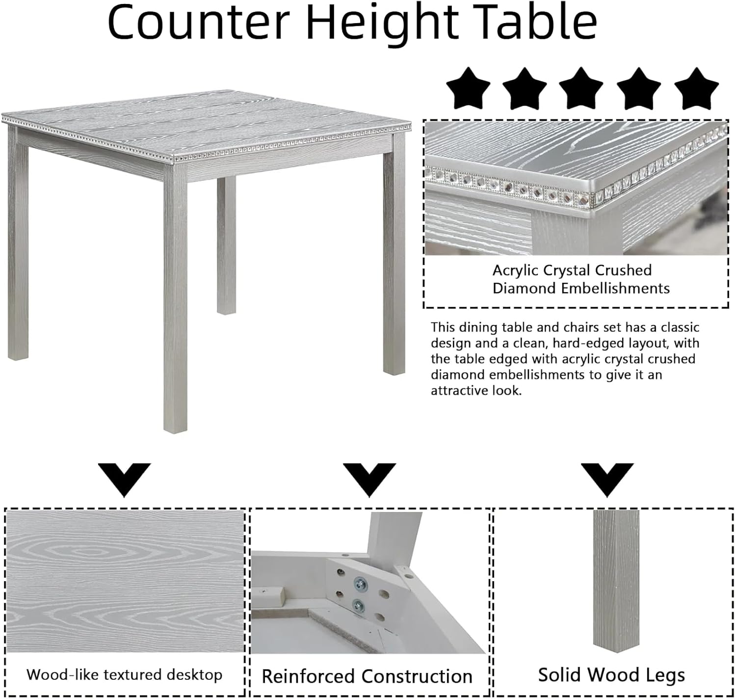 - Elegant Crystal-Accented Design:This counter-height set features a 34.5" square table with sparkling acrylic crystal embellishments along the edges, blending modern clean lines with subtle glamour. The 36" height creates an elevated dining experience