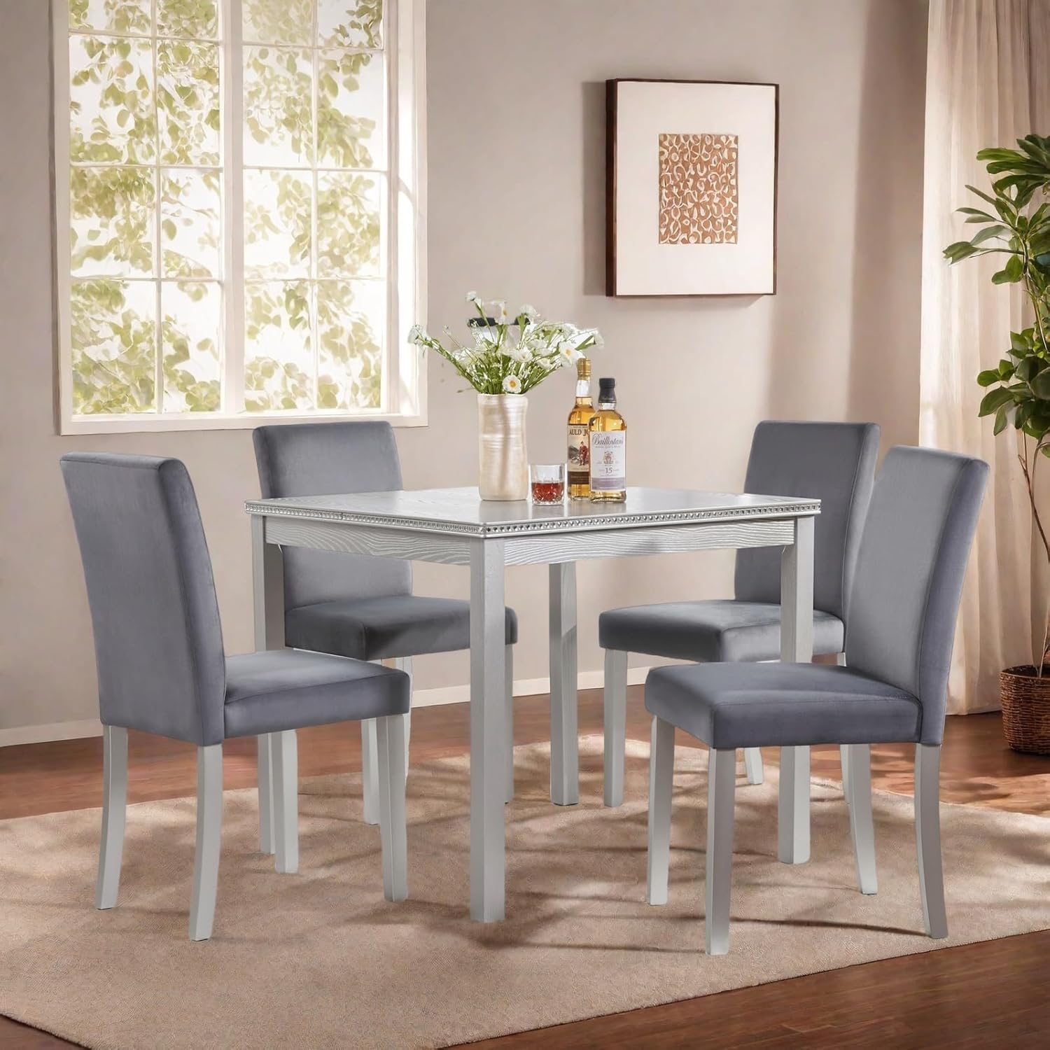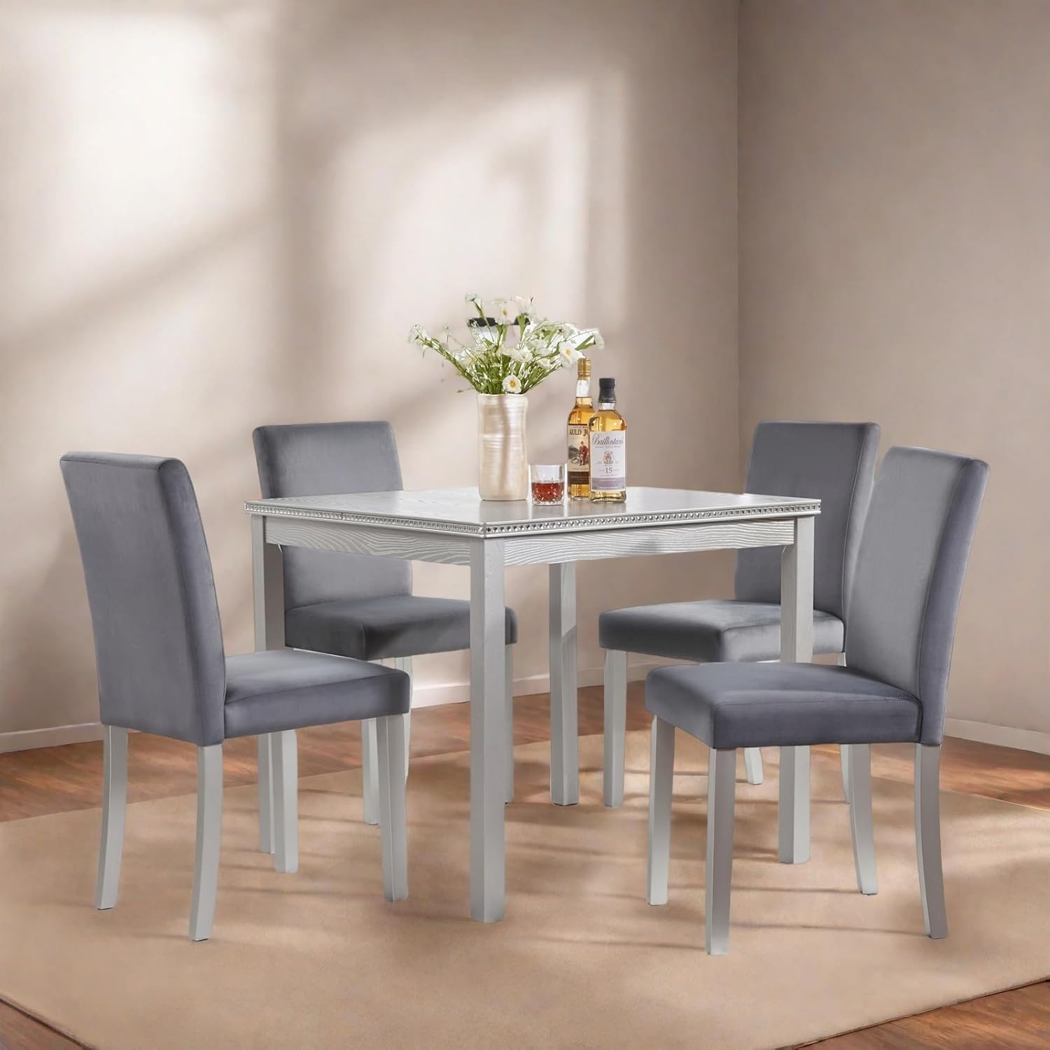 - Complete Ready-to-Use Set:Includes 1 table and 4 chairs with all necessary hardware.The neutral woodgrain and crystal accents complement both modern and traditional decors