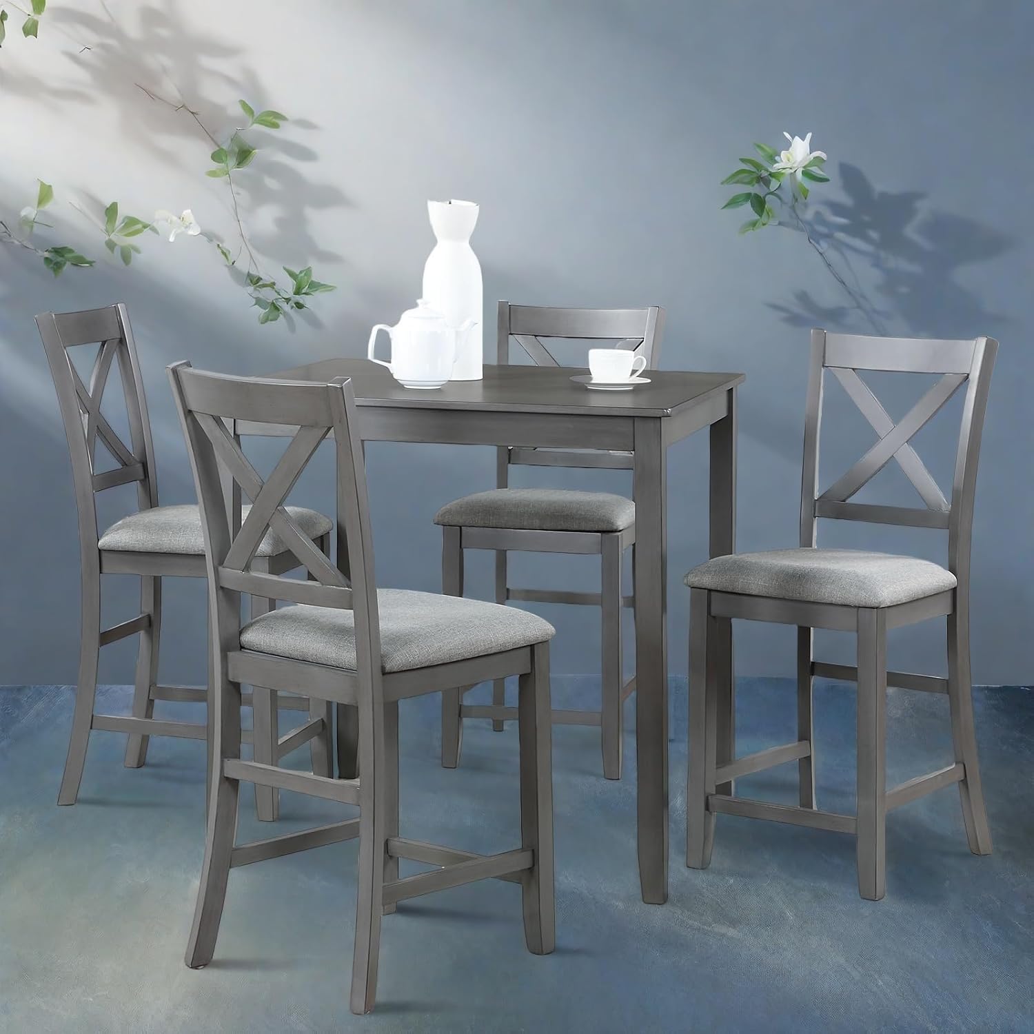Dining Table Set for 4, Modern 5 Piece Dining Room Table Set with Square Table & 4 X-Shaped Backrest Upholstered Chairs, Counter Height Kitchen Chairs Set for Small Space, Gray