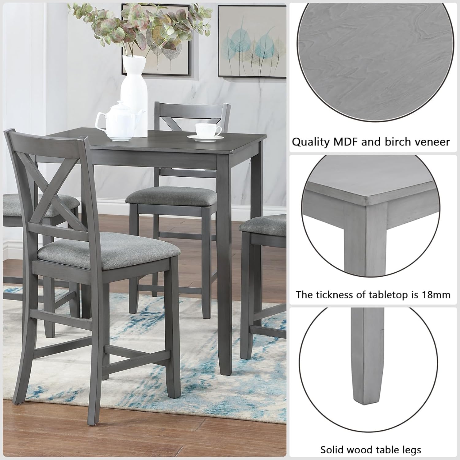 - Premium Material Construction:The table features solid wood legs with MDF core and real wood veneer for durability and authentic grain, paired with sturdy rubber wood chairs (330lb capacity each) featuring upholstered seats for comfort