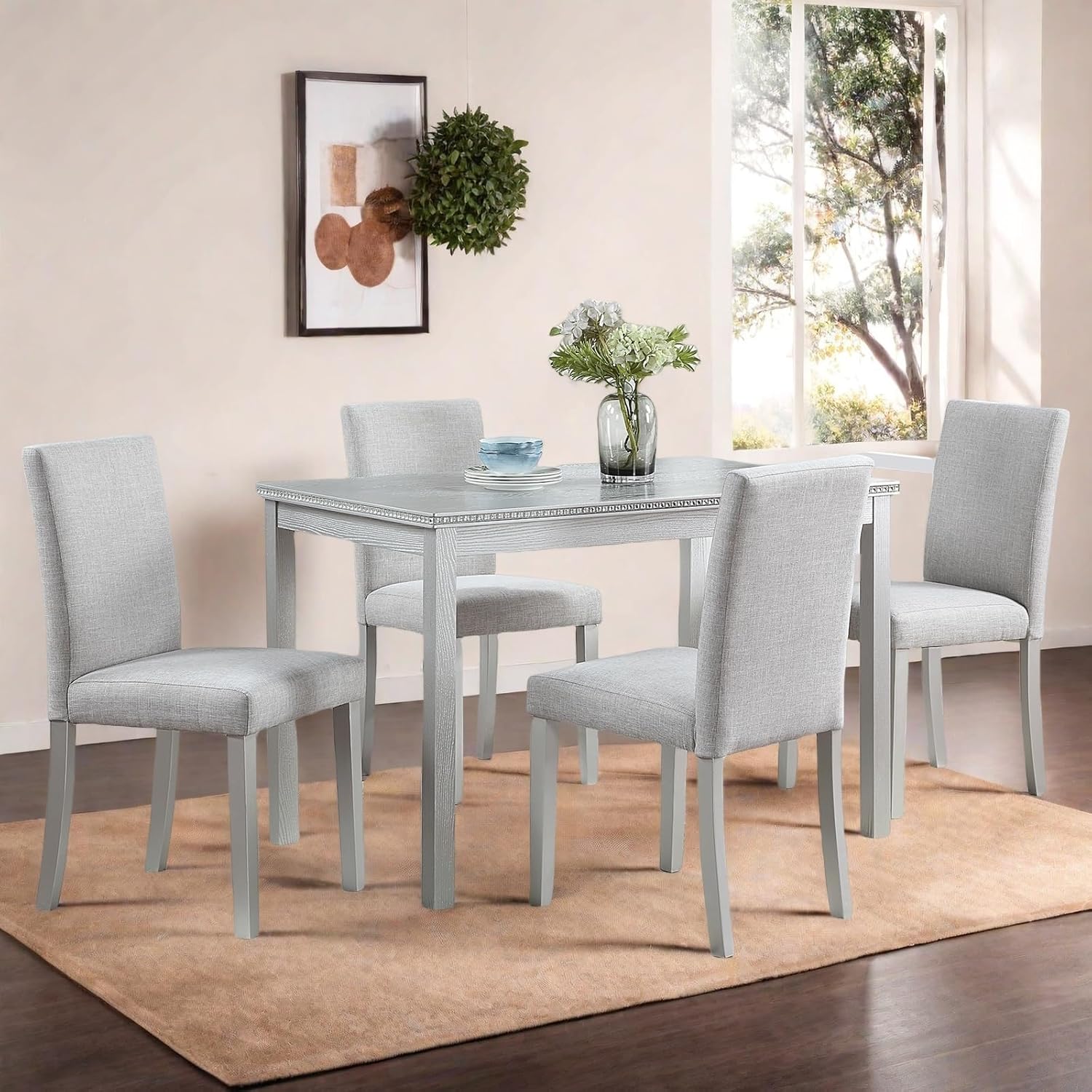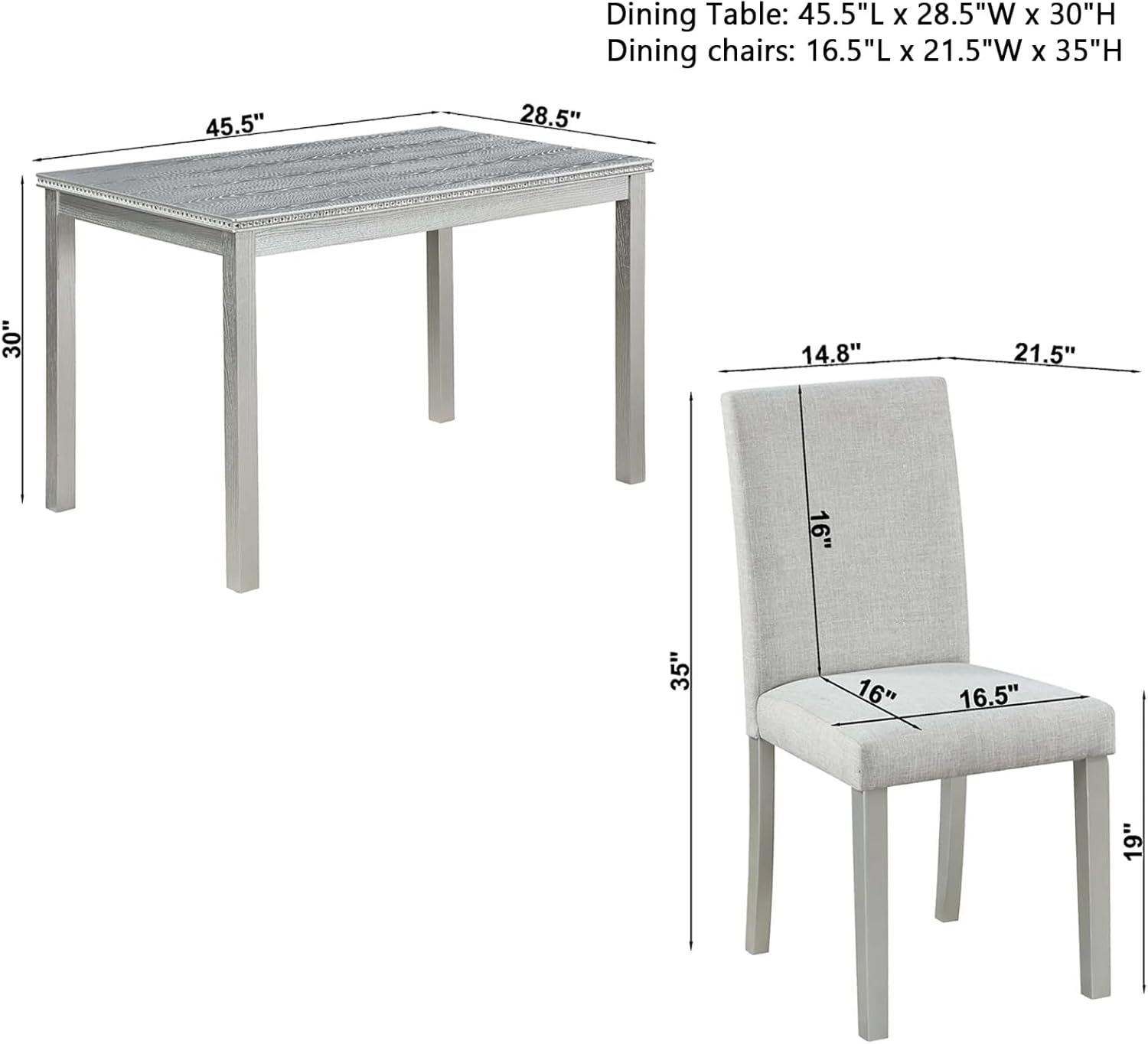 Dining Table Set for 4, 5-Piece Dining Room Table Set with Rectangular Crystal Decoration Table & 4 Upholstered Backrest Chairs, Counter Height Kitchen Sets with MDF Tabletop, Silver Gray