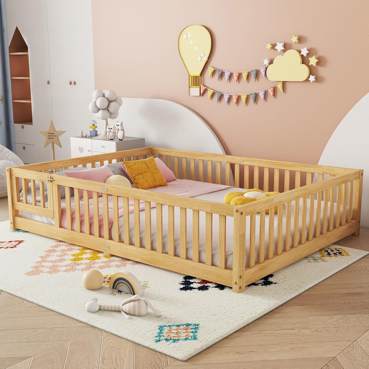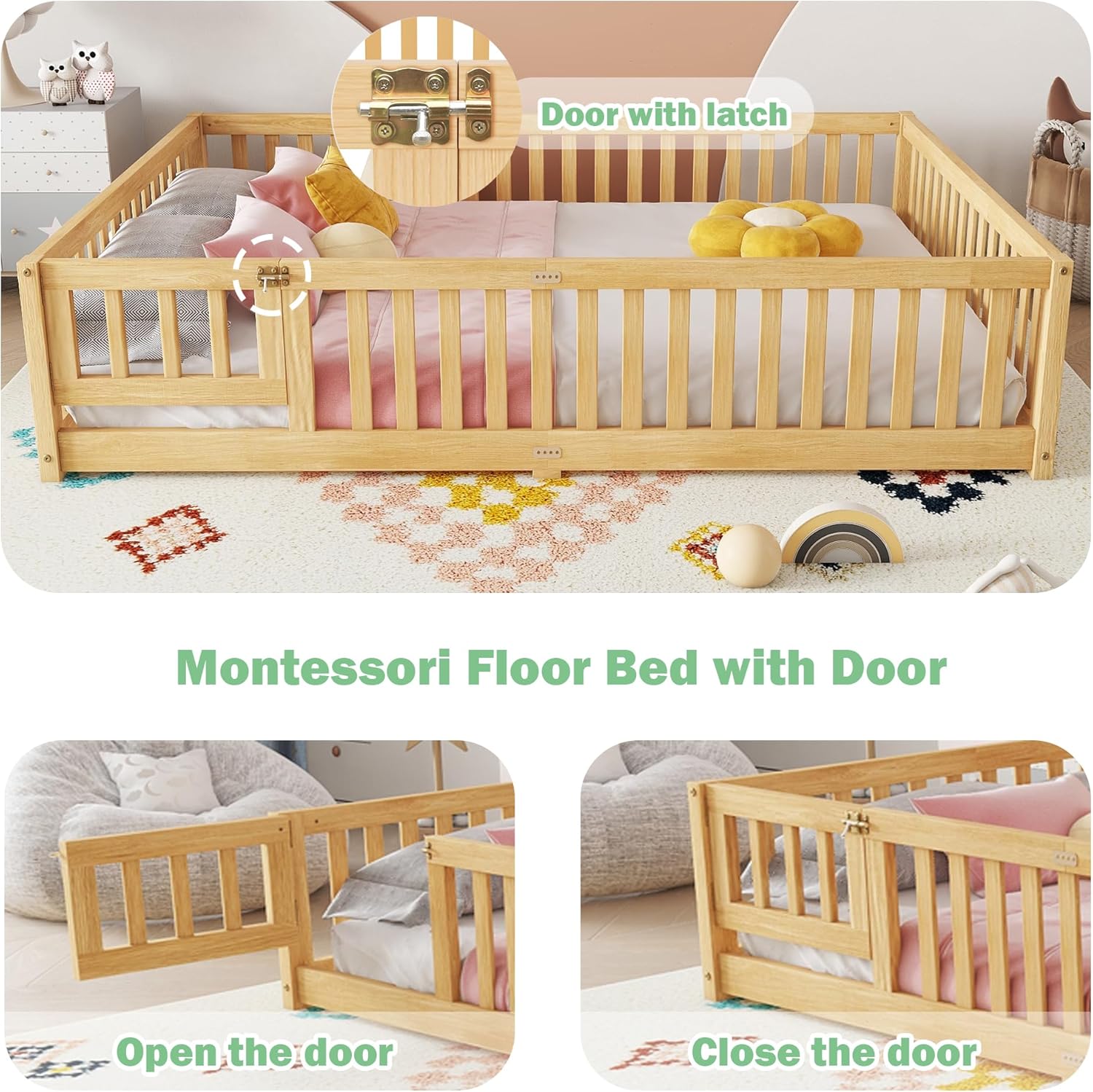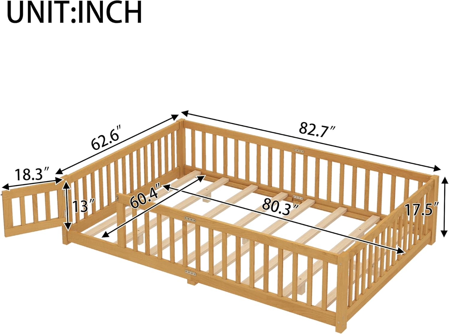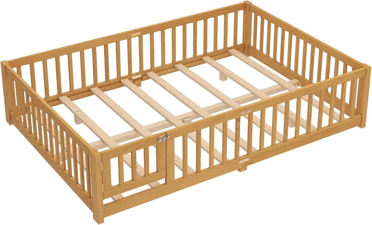 Queen Size Floor Bed Frame with Slats and Safety Guardrail, Wood Queen Size Montessori Floor Bed with Door and Fence, Easy Assemble Montessori Beds for Kids, Girls, Boys, Natural