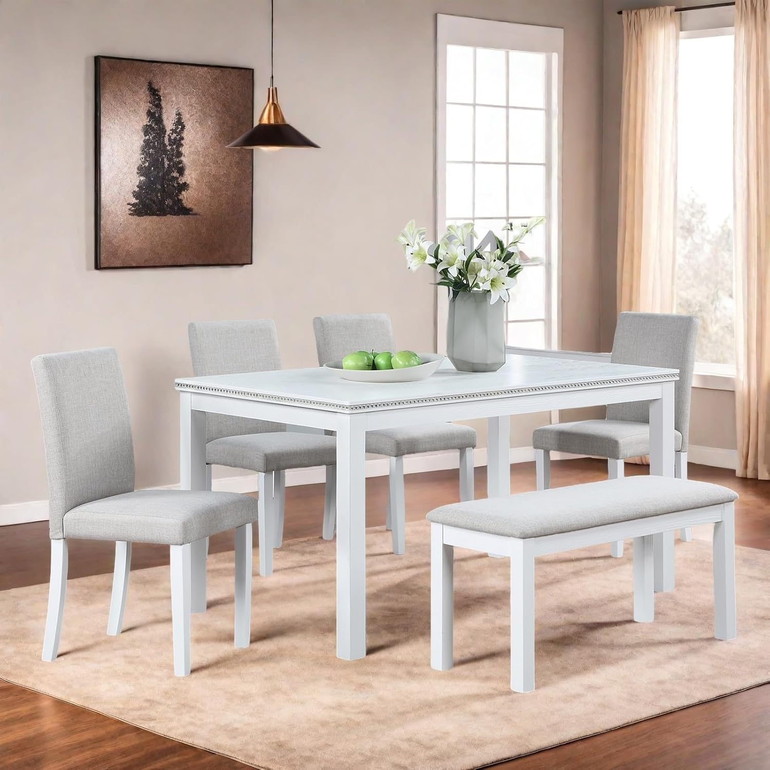 Dining Table Set for 5, 6 Piece Dining Room Table Set with Rectangular Crystal Decoration Table, 4 Upholstered Backrest Chairs and Bench, Counter Height Kitchen Sets with MDF Tabletop, White