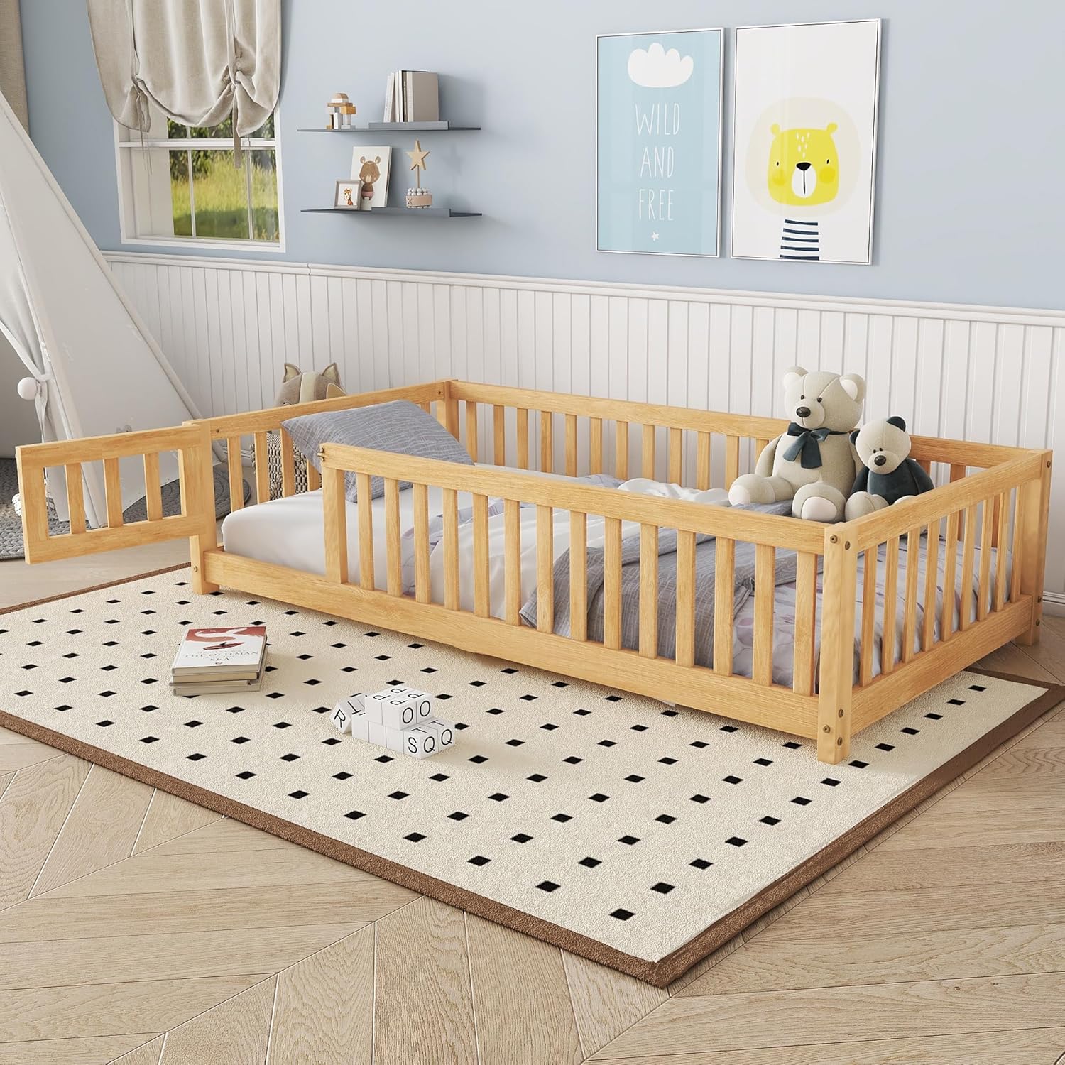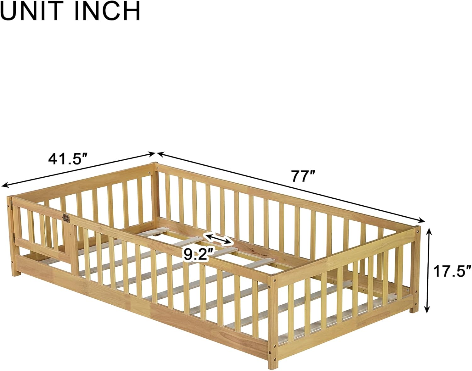 - 🥇🥇【Montessori Floor Bed with Fence and Door】The four guardrail of the montessori floor bed are not truncated, so our twin size floor bed is more stable than a regular floor bed. There is a small door that can be opened and closed, which increases the interest of the montessori floor bed and creates a more safety sleeping space. Fence Hight: 16". Note: The Door is removable.