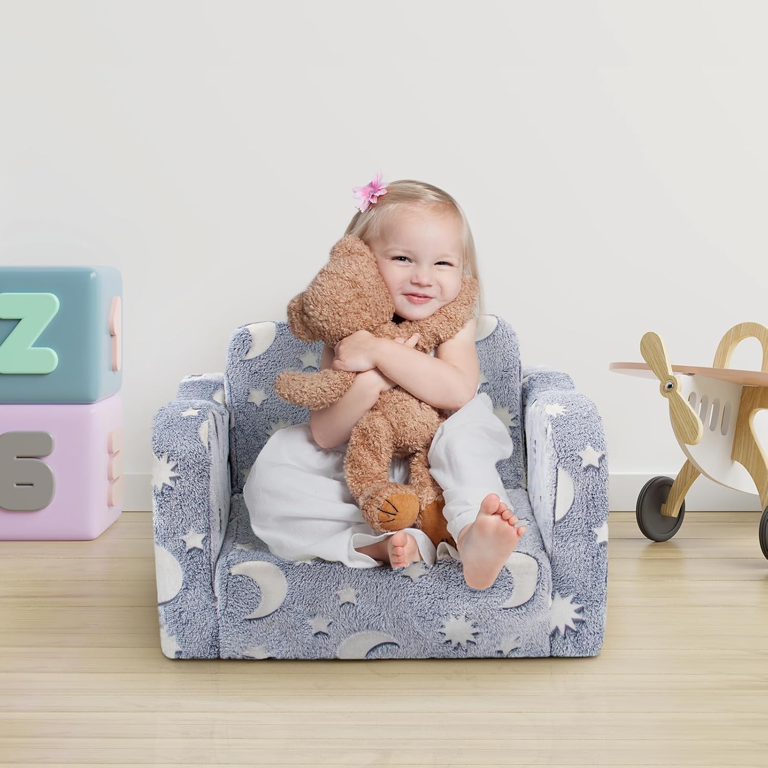 Kids Toddler Chair, 2-in-1 Toddler Couch Fold Out, Convertible Chairs for Toddlers Comfy Sofa to Lounger with Glow in The Dark Feature, Soft for Girls and Boys