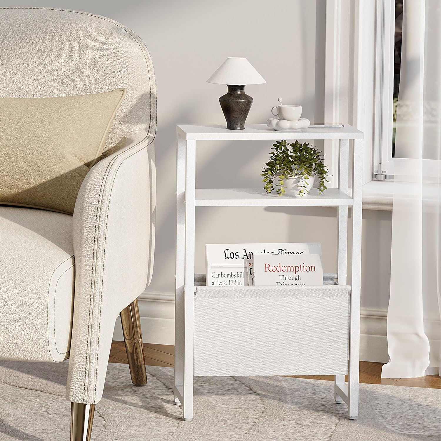 Narrow Side Table, Slim End Table with Magazine Rack, Bedside Table for Small Spaces, 3 Tier Sofa Couch Table Nightstand for Living Room, Bedroom, White LET503W