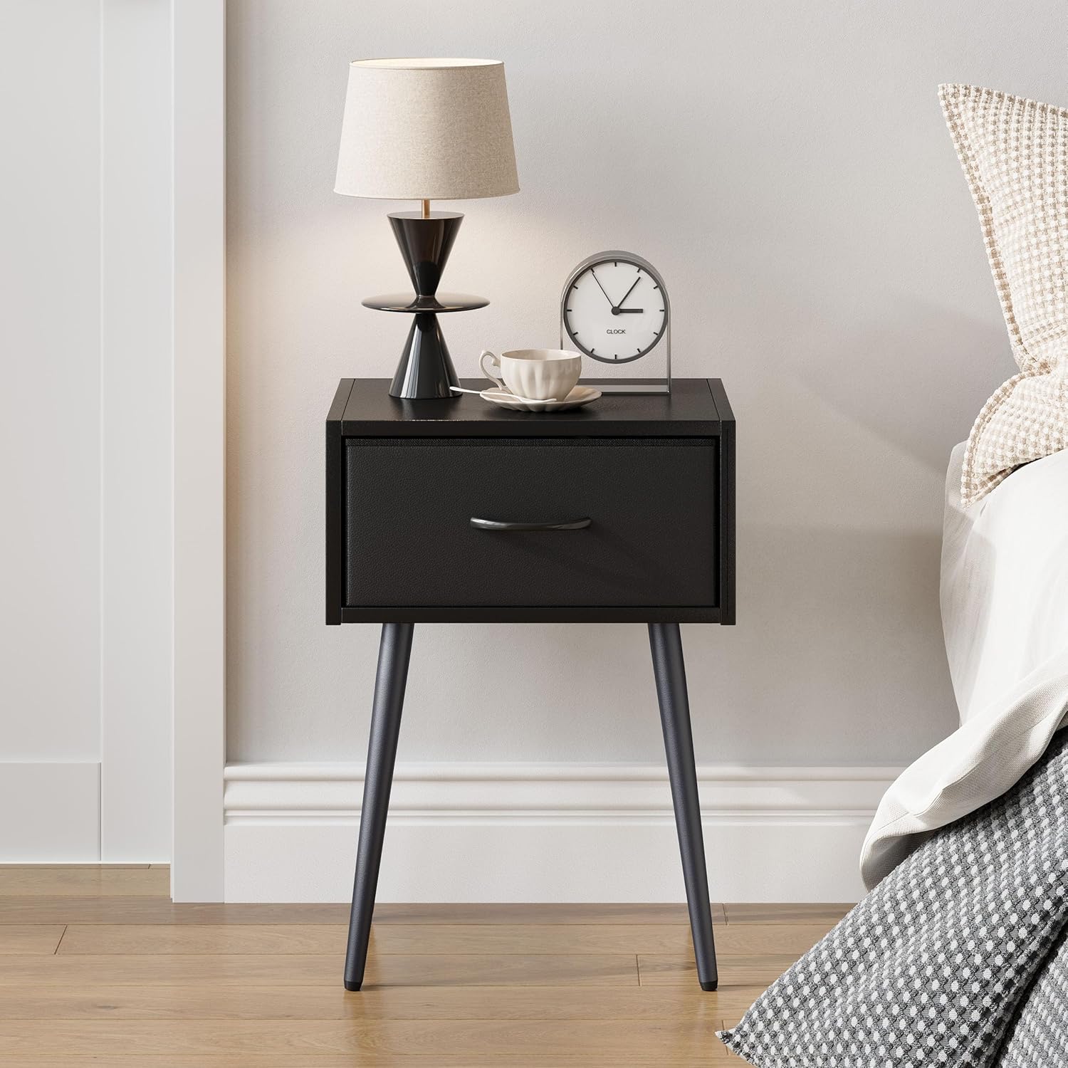 Black Nightstands Set of 2, Small Bedside Table with Fabric Drawer, Modern End Table with Metal Leg, Couch Side Table for Bedroom Living Room, Sofa, Office LNT504B