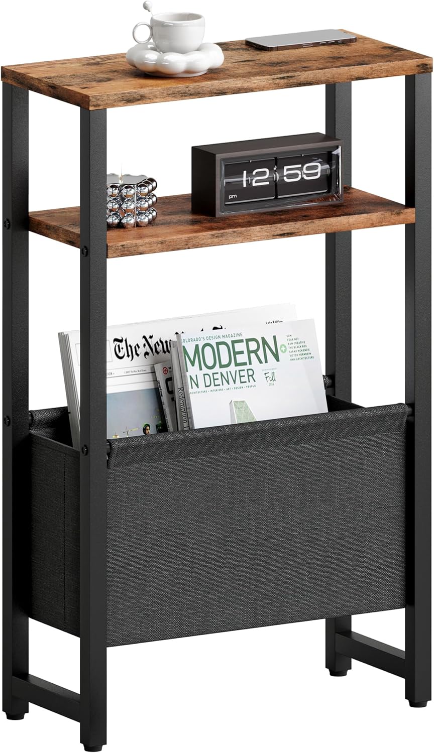 Narrow Side Table, Slim End Table with Magazine Rack, Bedside Table for Small Spaces, 3 Tier Sofa Couch Table Nightstand for Living Room, Bedroom Rustic Brown LET503R