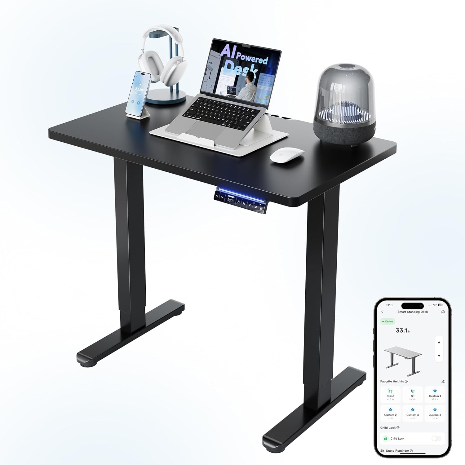 HUANUO One-Piece 32 inch Electric Standing Desk, Smart APP, Alexa & Google Voice Control, Wi-Fi, Adjustable Height, 6 Memory Settings, Sedentary Reminder, Posture & Neck Care, Black