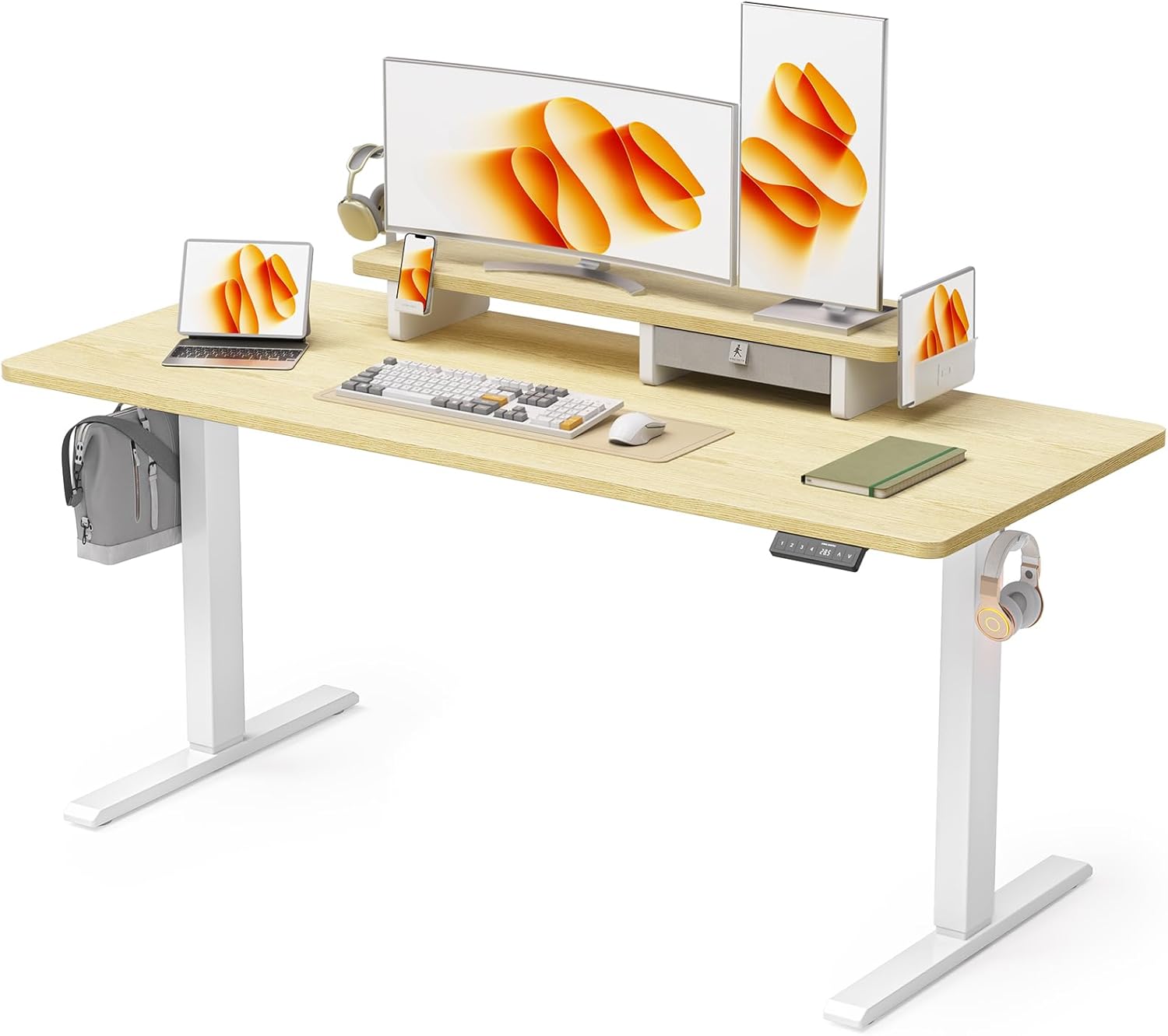 63x24 Inches Electric Standing Desk with Drawer and Monitor Stand, Height Adjustable Sit to Stand up Desk for Home Office, Ergonomic Computer Table with Phone Holder, 3 Hooks, Oak