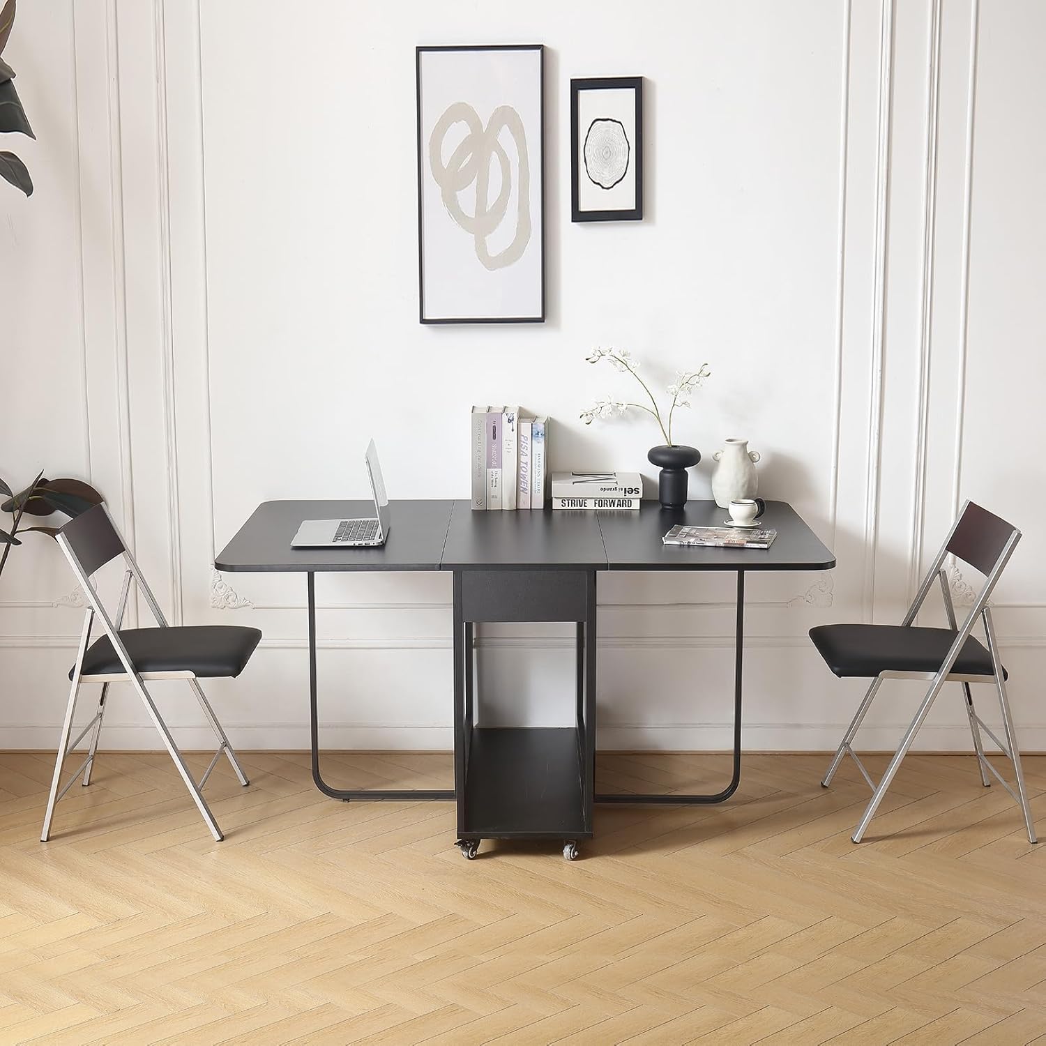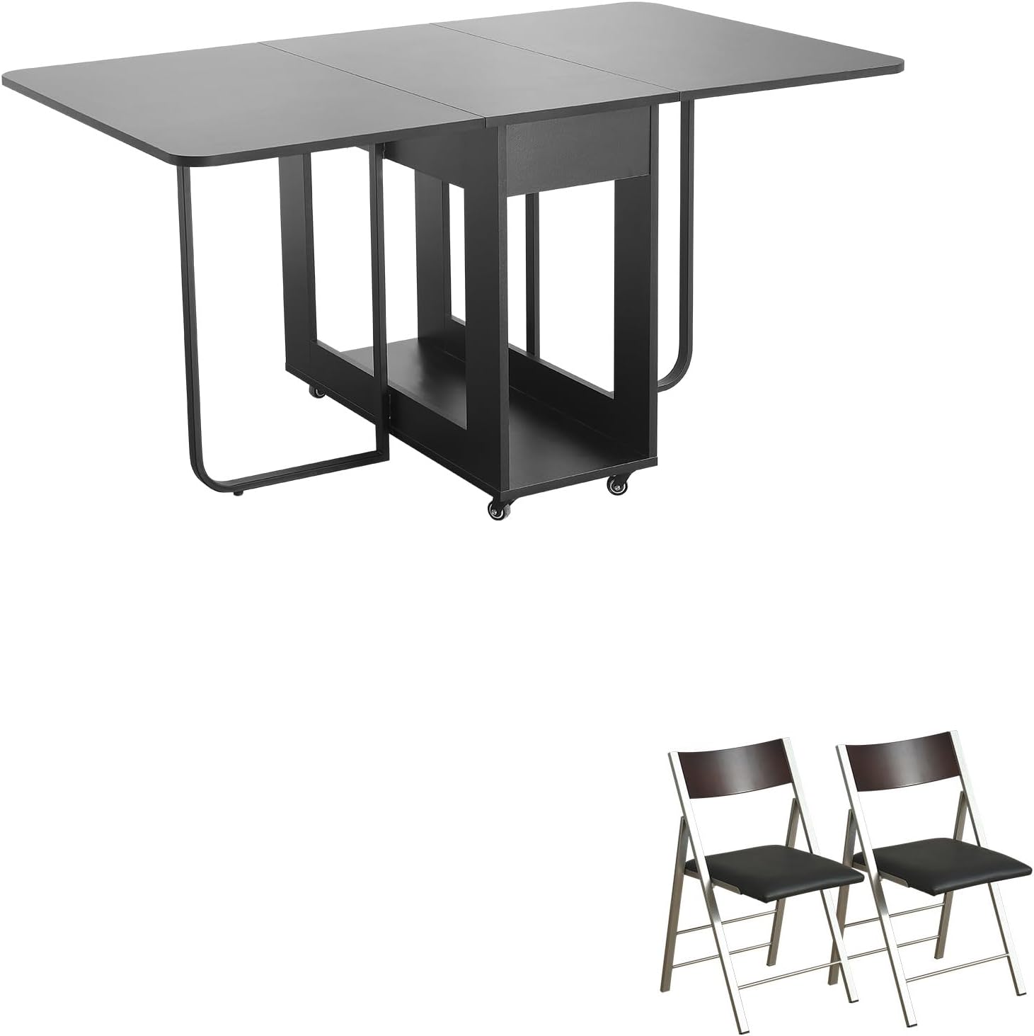 Folding table and chair set, dining table with extra large storage space and 4 universal wheels, matched with padded steel frame folding chairs, space-saving dining table and 2 chairs (Black)