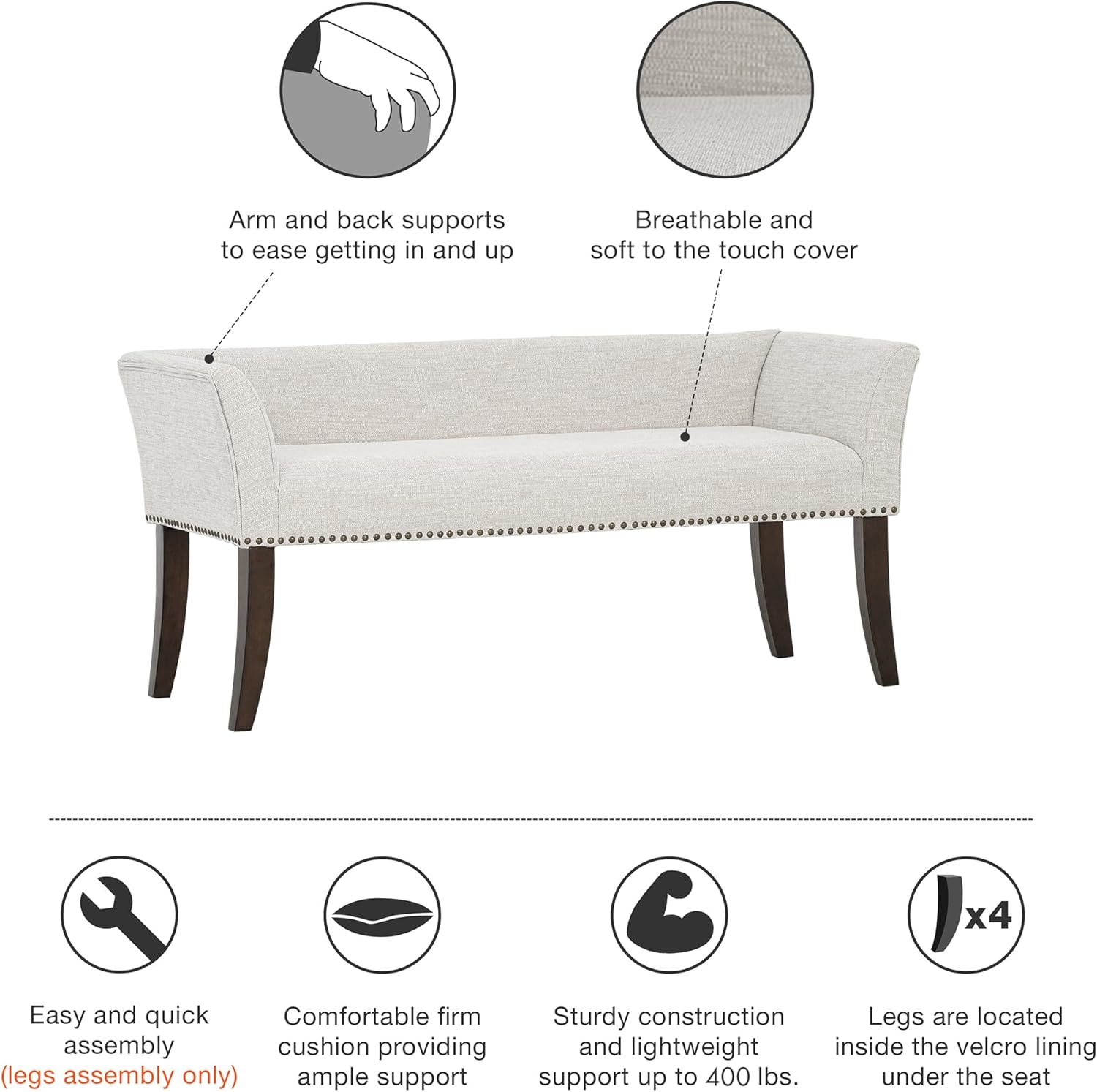 - Compact & Elegant - Elevate your space with our modern small bench. Featuring a stylish tan herringbone fabric, Morroco wood legs, and bronze nailhead accents, it seamlessly blends support and elegance with arm and backrests