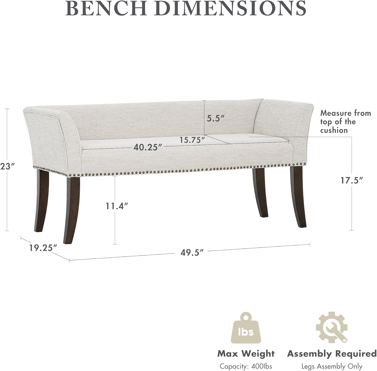 - Dimension - Overall 49.5"W x 19.25"D x 23"H. Seat 40.25"W x 15.75"D x 17.5"H. Easy assembly required. The product is neatly packaged in a single box for your convenience, with parts and tools securely stored inside the bottom lining of the seat Arms 40.25"W x 23"H Back Rest 49.5"W x 5.5"H Leg Height 11.4" Clearance under Bench 11.4" Maximum Weight Capacity 400 lbs