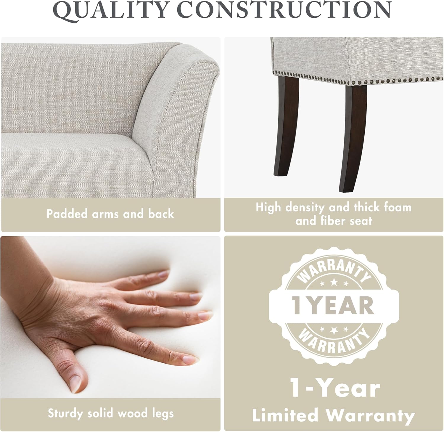 - Material: Crafted for durability, the frame is made of solid wood and plywood. For comfort, it features high-density foam & high-quality, soft-to-the-touch fabric. The solid wood frame offers exceptional sturdiness, supporting up to 400 lbs