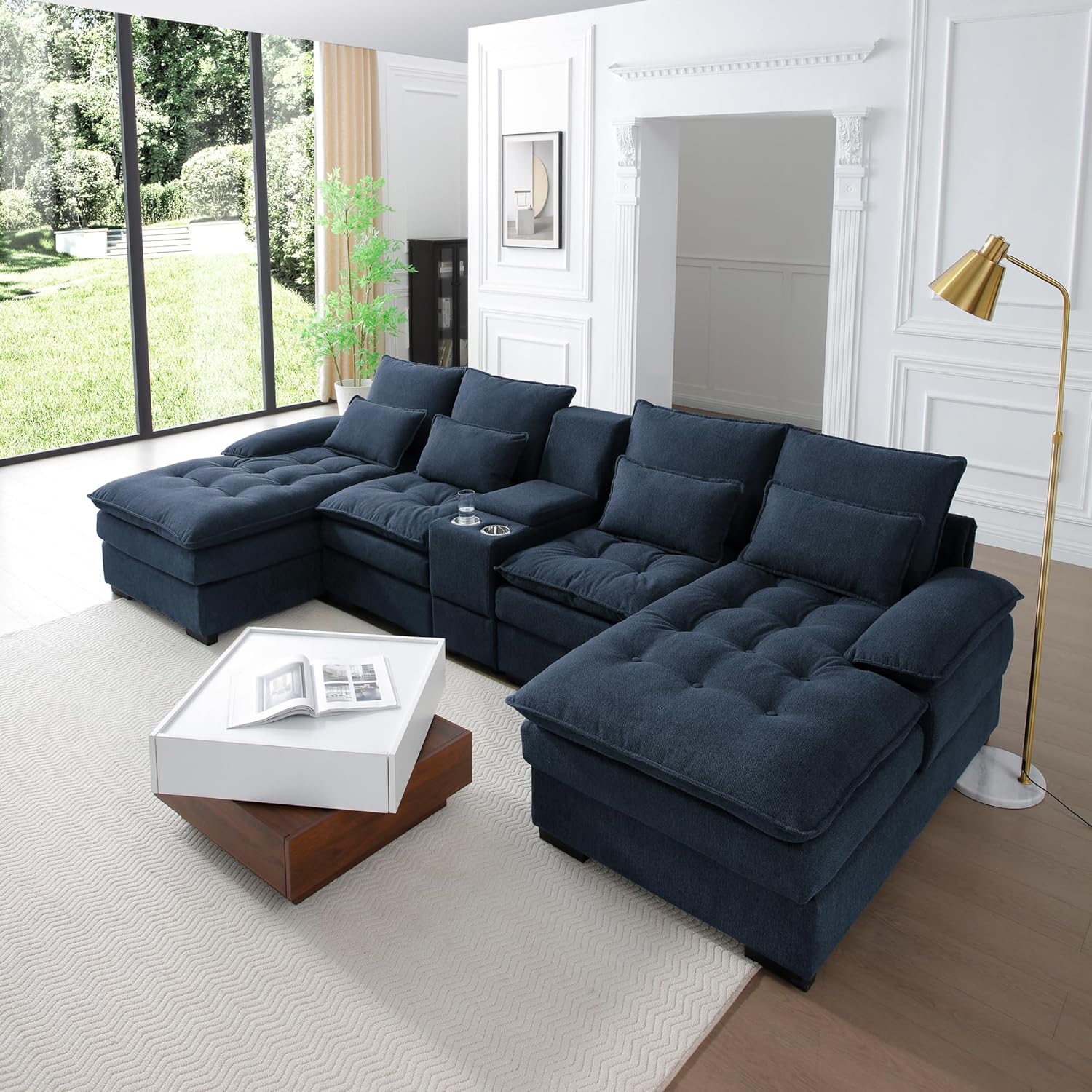 KEIKI 130" U-Shaped 6 seat Sofa with Storage Console, Cup Holders, Upholstered Sectional Sofa, Button Tufted Cloud Cushion Couch for Home, Office, Apartment, Blue