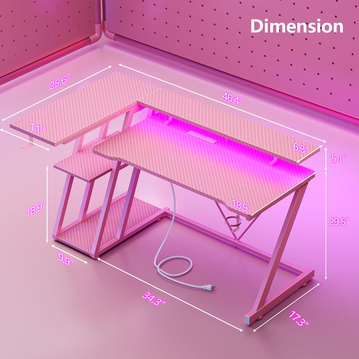 47 Inch Pink Gaming Desk with Power Outlet & LED Lights, Corner Computer Desk with 3 Tiers Storage Shelves, L Shaped Gaming Desk with Monitor Stand for Bedroom
