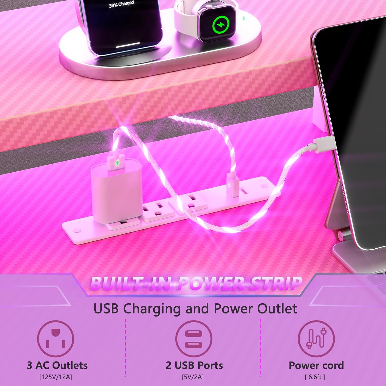 - Gaming desk with LED lights: Coming with an RGB LED light strip with APP control, this pink gaming desk looks great when illuminated by the light strip and will enhance your gaming atmosphere