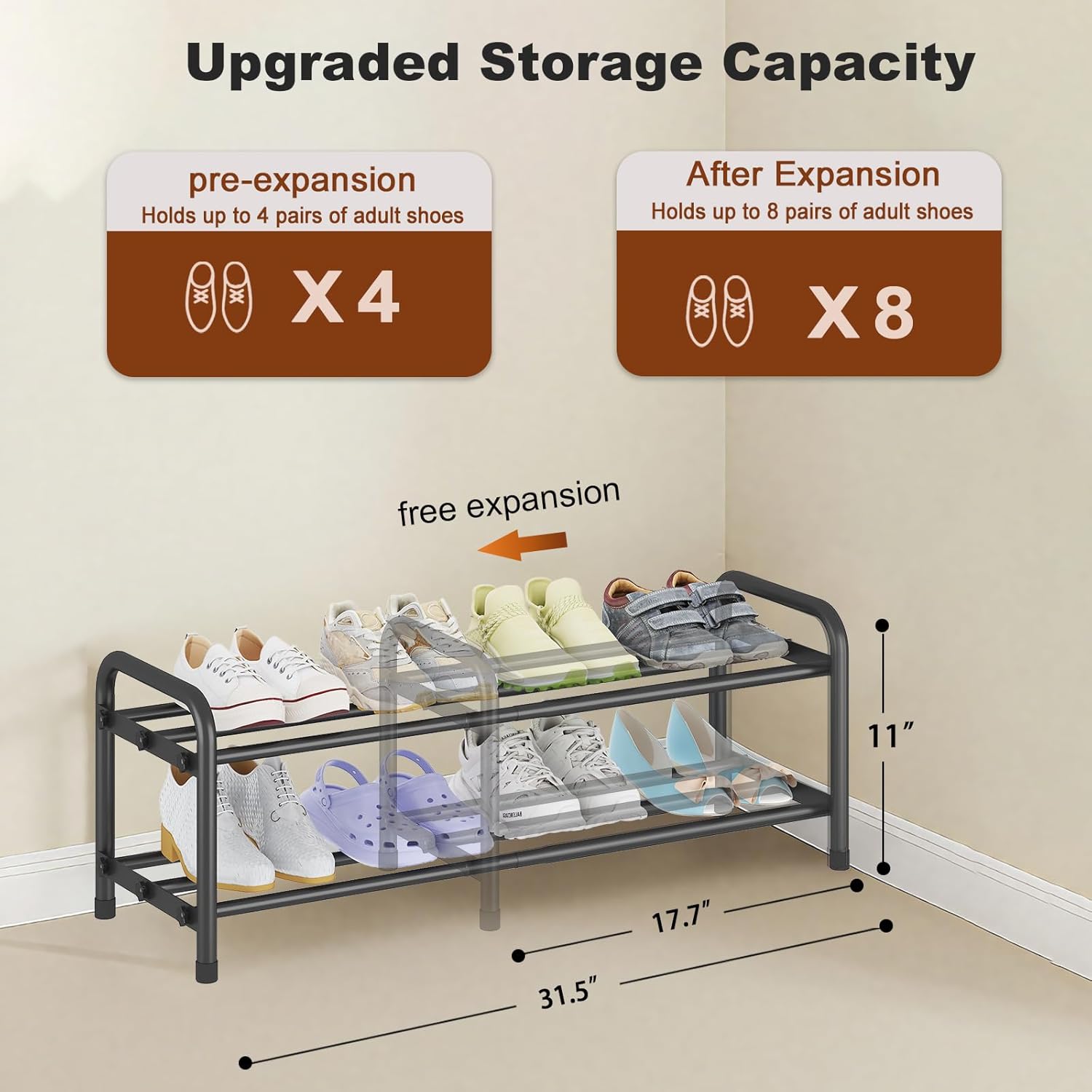 - Adjustable Length for Any Space – The expandable shoe rack stretches to fit tight spots, making it ideal as a shoe rack for closet, entryway, or even a small shoe rack for apartments and dorm rooms.