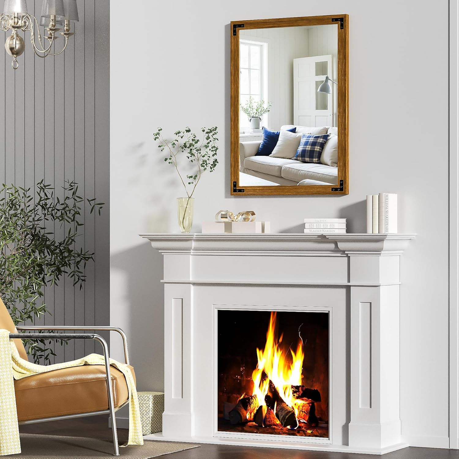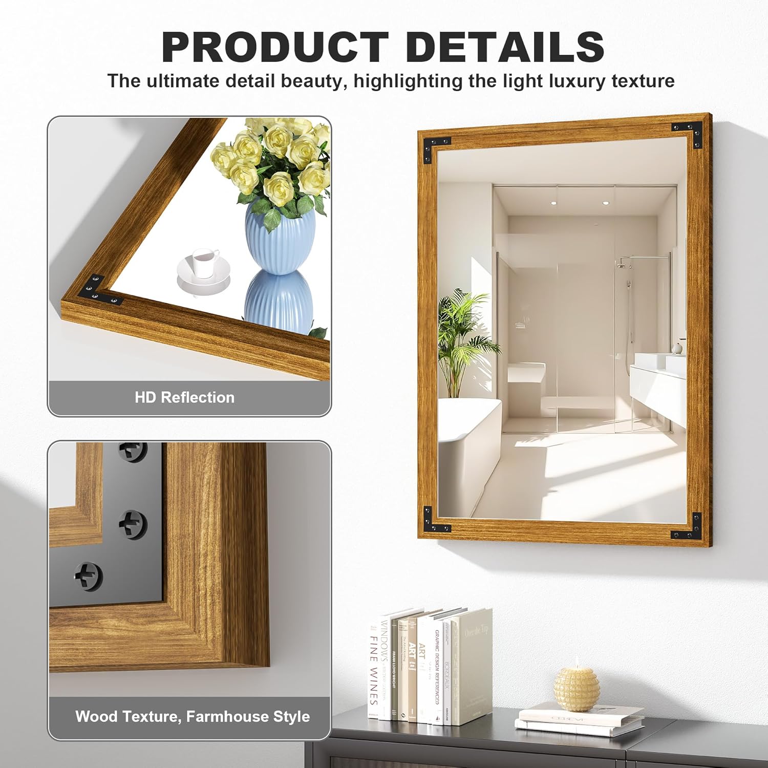 - Stylish Wood Frame: Featuring unique wood grain textures, this mirror enhances the farmhouse aesthetic, adding a touch of rustic charm to any space.