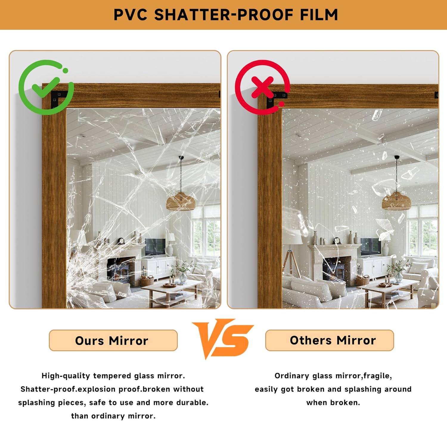 - Versatile Decorative Mirror: With its sturdy construction and explosion-proof, scratch-resistant surface, this mirror is perfect for bathrooms, bedrooms, entryways, and living rooms, complementing both rustic and modern interiors.