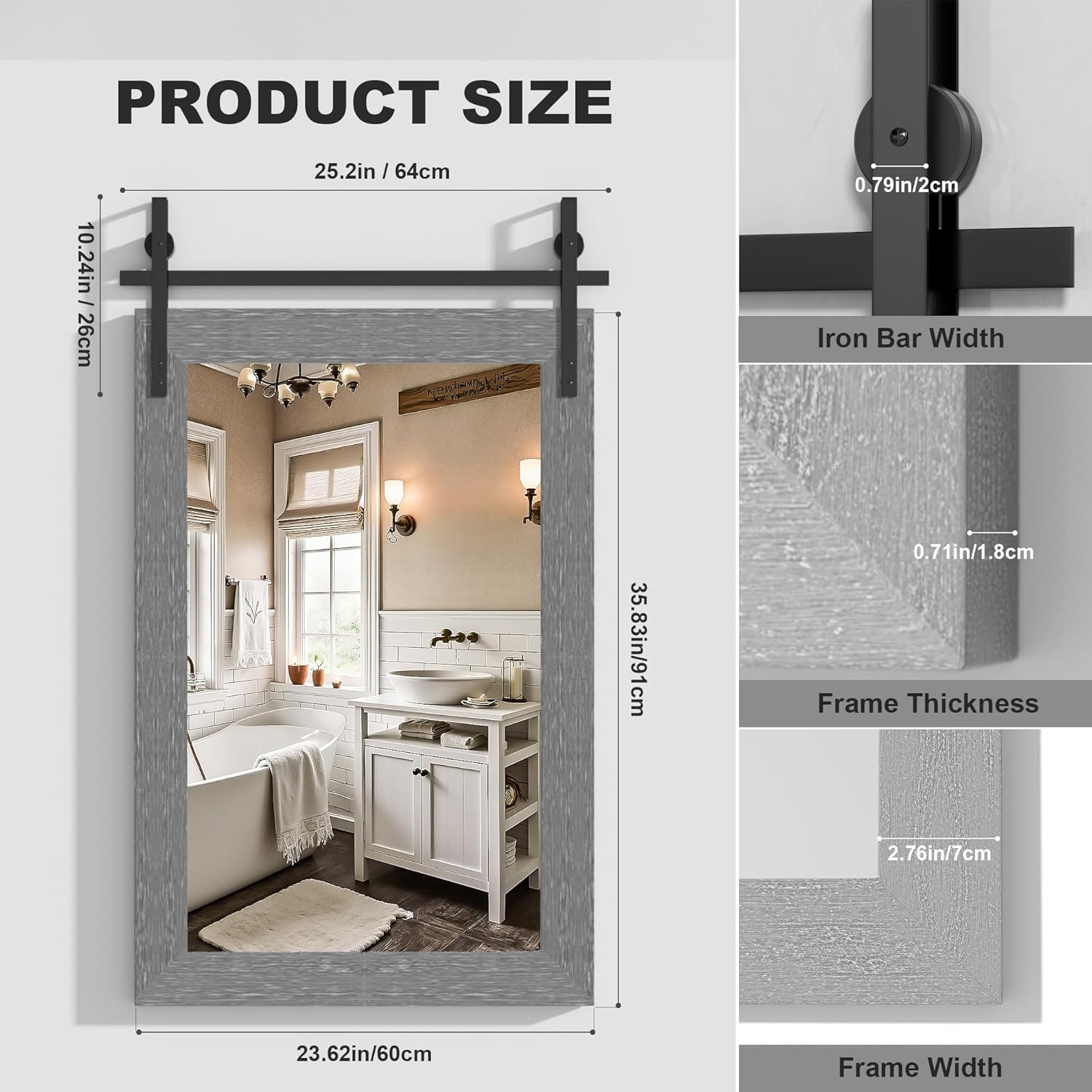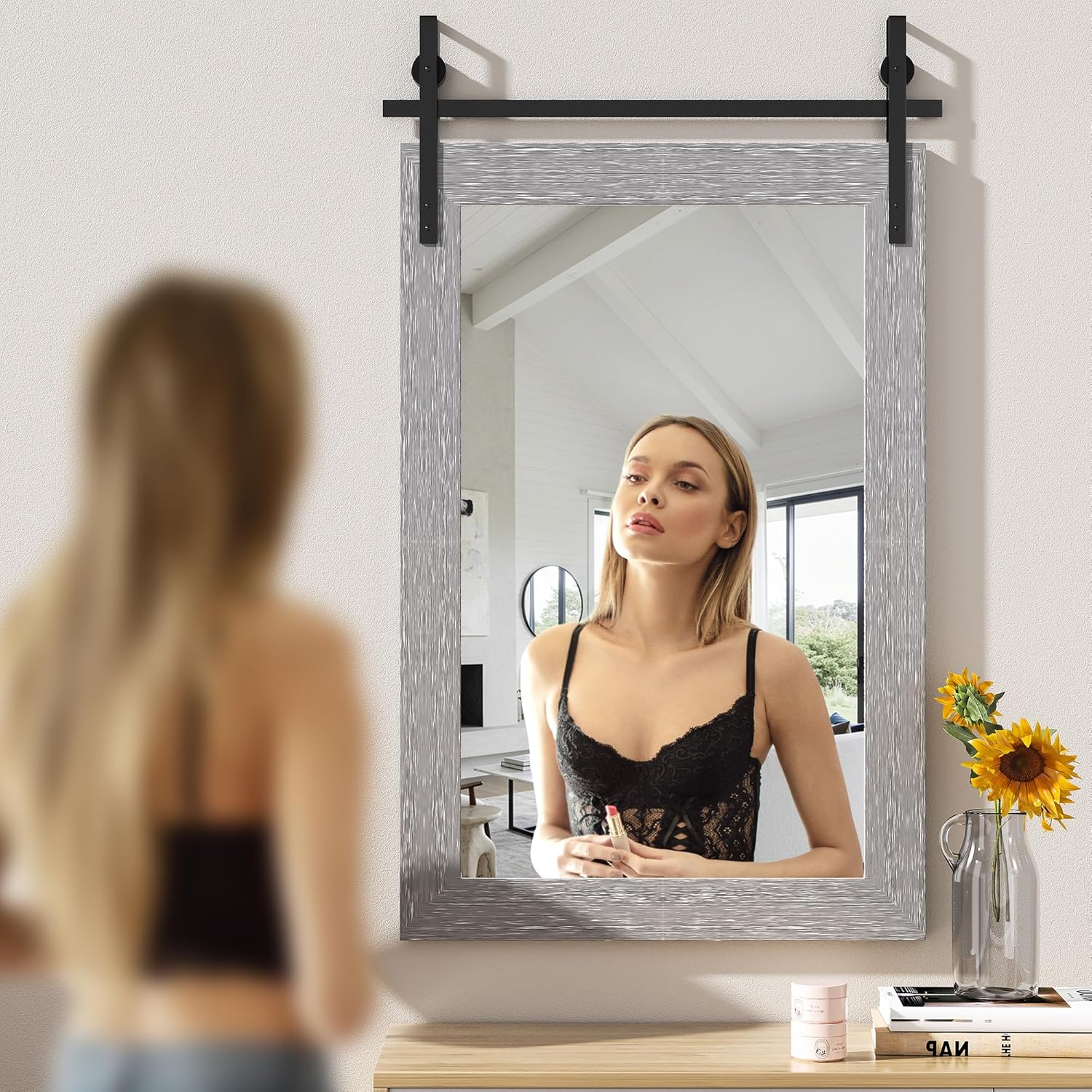 Hasipu Farmhouse Bathroom Mirror, 24"x36" Rustic Wood Framed Wall Mounted Mirror, Gray Vintage Vanity Mirror Barn Door Style Decrative Mirrors