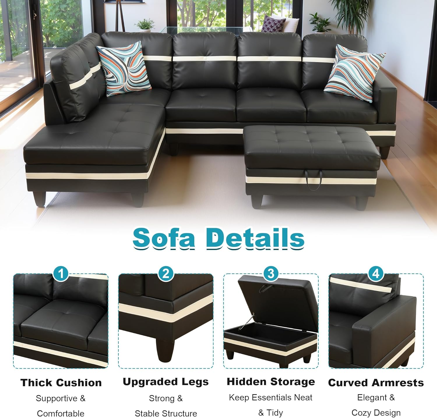 103.5" Oversized Sectional Couch, L Shaped Couch with Storage Ottoman, Modern Modular Sofa with Deep Seat, Sectional Couches for Living Room and Office, Black and White (PU Leather)