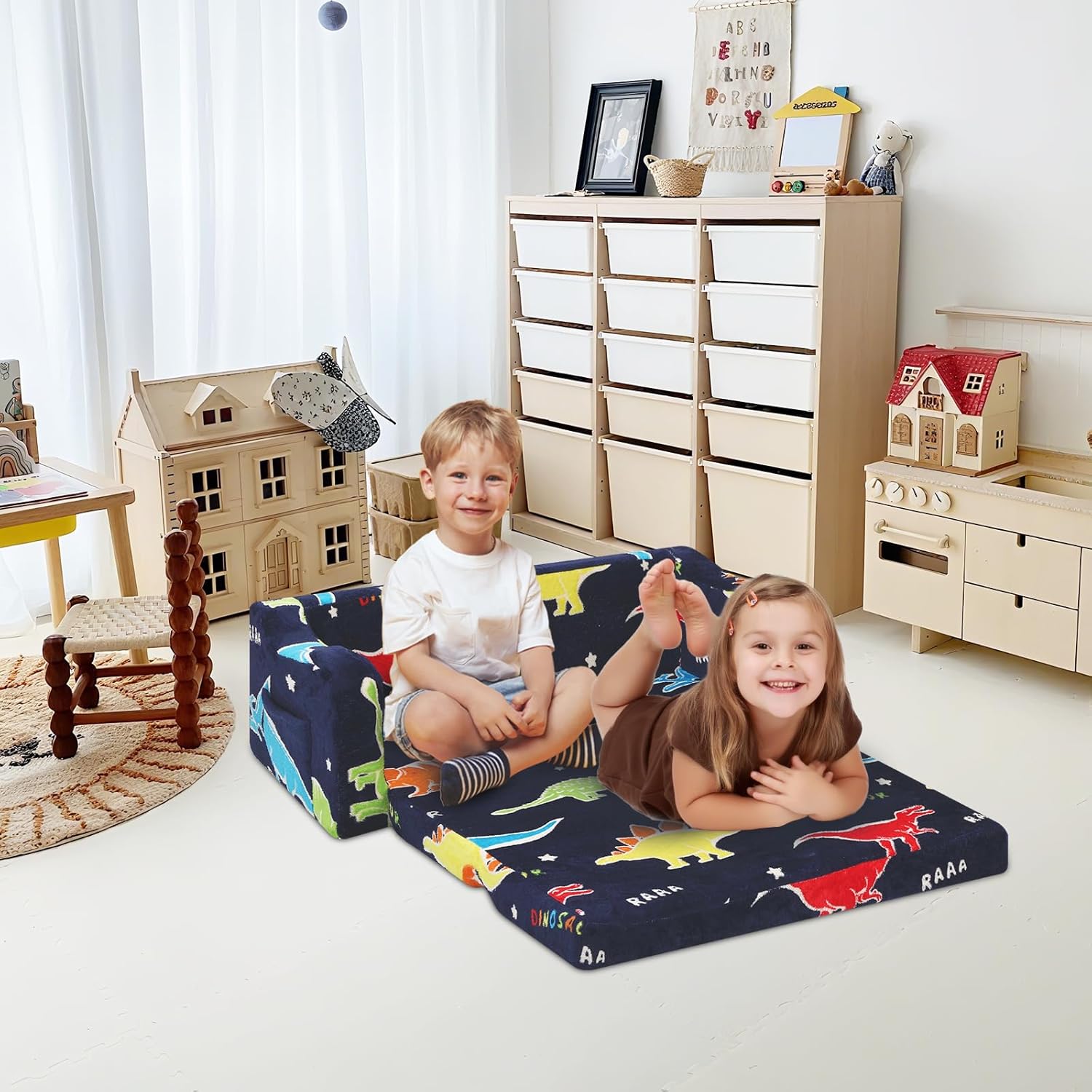 Kids Couch Extra Large,Glow in The Dark 2-in-1 Folding Kids Sofa Bed for Boys,2 Seats Convertible Sleeper Lounger Toddler Couch for Children Bedroom Playroom Nursery,Dinosaur