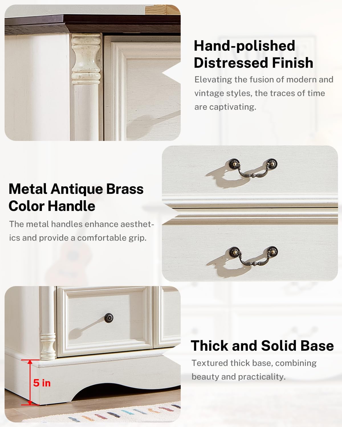 - 【The Sublimation of Classical and Vintage Style】: Our 6-drawer dresser features embossed textures and a luxury white finish. The brown, thick panel features a surface that has been artificially polished to achieve a naturally worn look, reflecting its historical sense of use. with smooth lines that retain the classic of traditional American style. The antique copper-tone metal handles add a classic touch, creating a personalized and unique aesthetic.