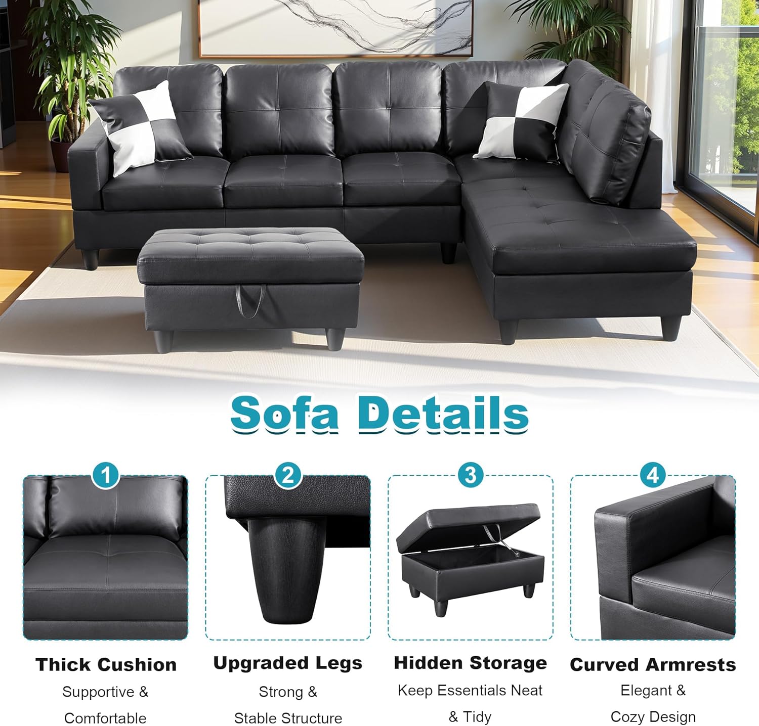 103.5" Oversized Sectional Couch, L Shaped Couch with Storage Ottoman, Modern Modular Sofa with Deep Seat, Sectional Couches for Living Room and Office, Jet Black (Faux Leather)