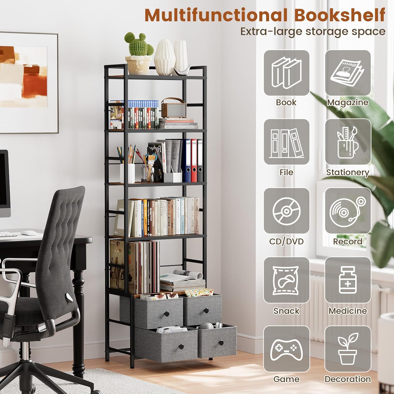 - More storage space: Tall bookcase comes with 4 fabric drawers and 4 adjustable bookends, allowing you to easily store all your everyday household items. It keeps your books and magazines tidy and organized, making the most of every inch of space.