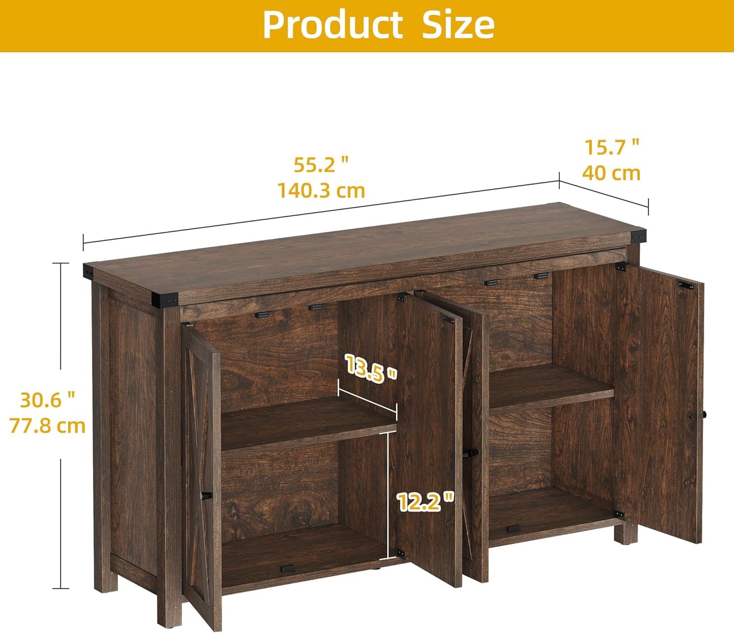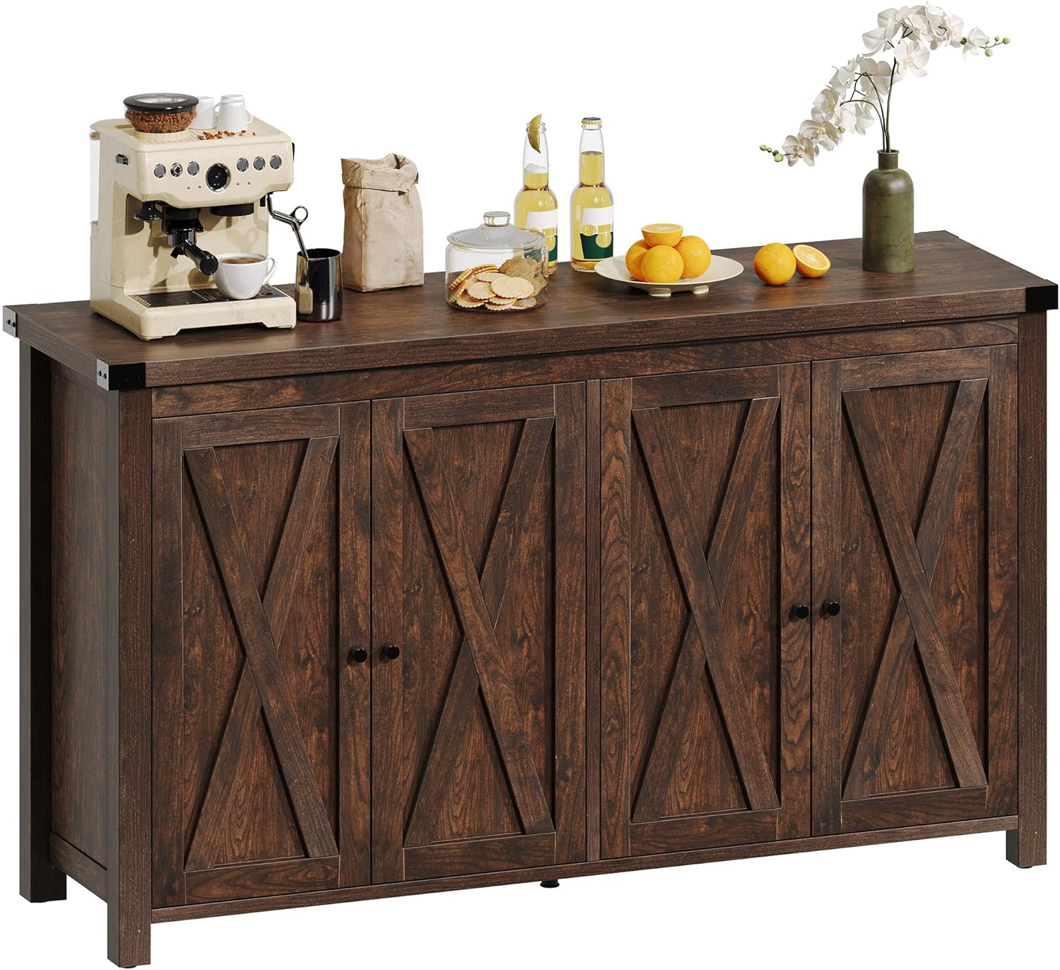 - Ample Storage Space: The kitchen storage cabinet features 4 doors cabinet with an adjustable shelf to meet your storage needs for coffee beans, seasoned, and some sundries, while the 55" wide tabletop creates an accessible way to display microwave, toaster, and coffee makers
