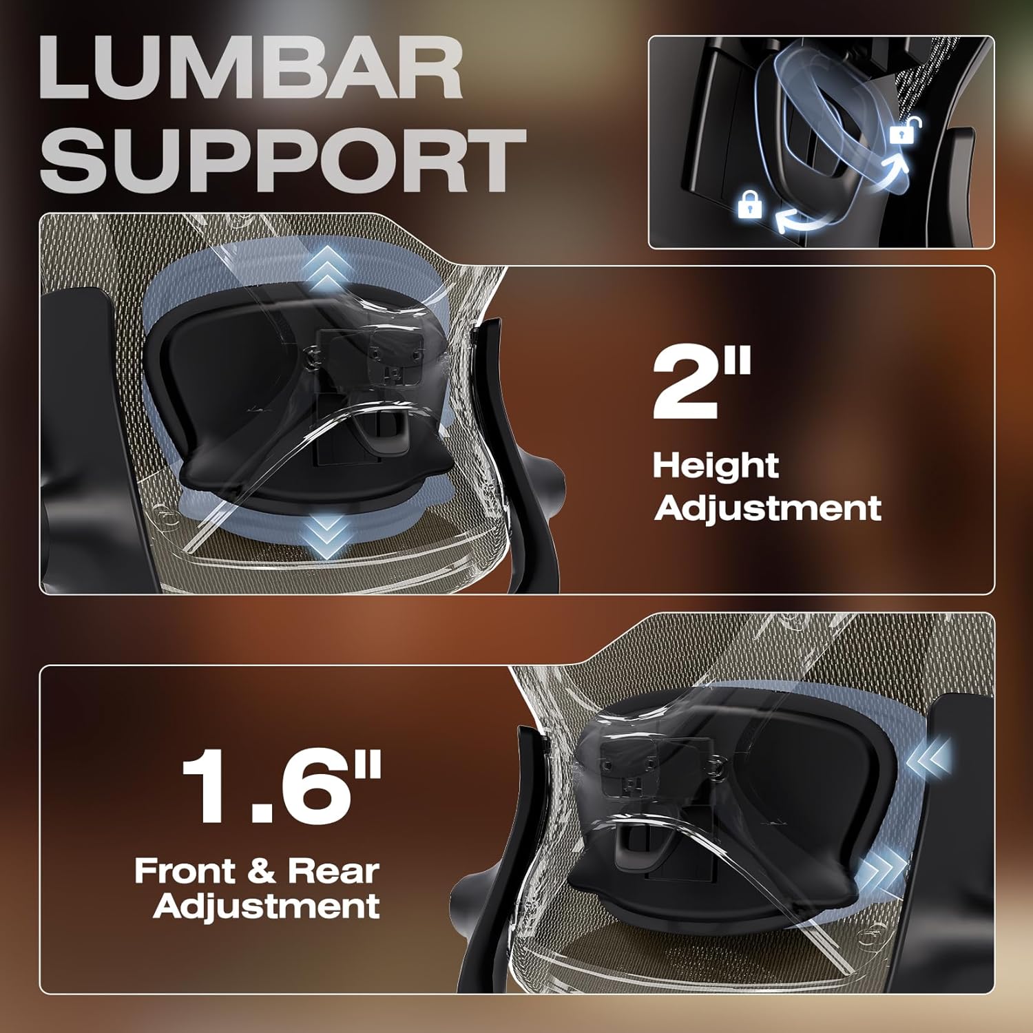 - 【Engineered with Dynamic Spinal Alignment System】3D Synchro-Tilt Lumbar(Lockable ±1.6" depth spring-loaded auto-tracking/±2" height/15° rotation)with force-sensitive springs mimics natural spine curvature, certified by AEP* for 12hrs+ fatigue reduction in ergonomic chairs (*American Ergonomics Partnership)