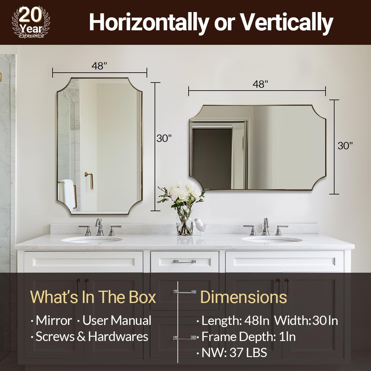- 【Rust-Proof Stainless Steel Frame】: (N.W: 37LBS). Crafted from stainless steel with oxidation-resistant properties, this brass rectangle mirror for bathroom offers enhanced stability and a longer lifespan