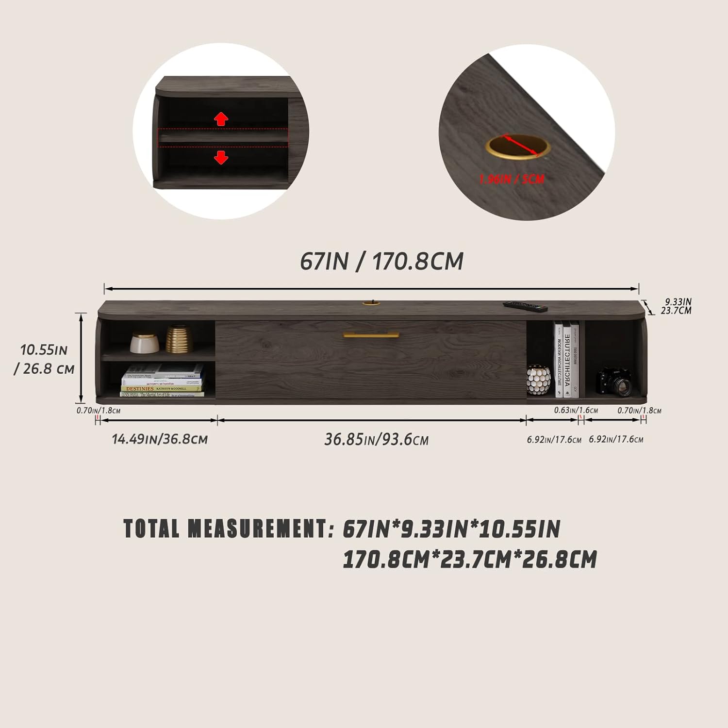 - [Wire Management] Our floating media console with cable holes helps you to get rid of messy cables. The 2 cable holes on the top and bottom for hiding wires keeping your stuff neatly organized and within reach!