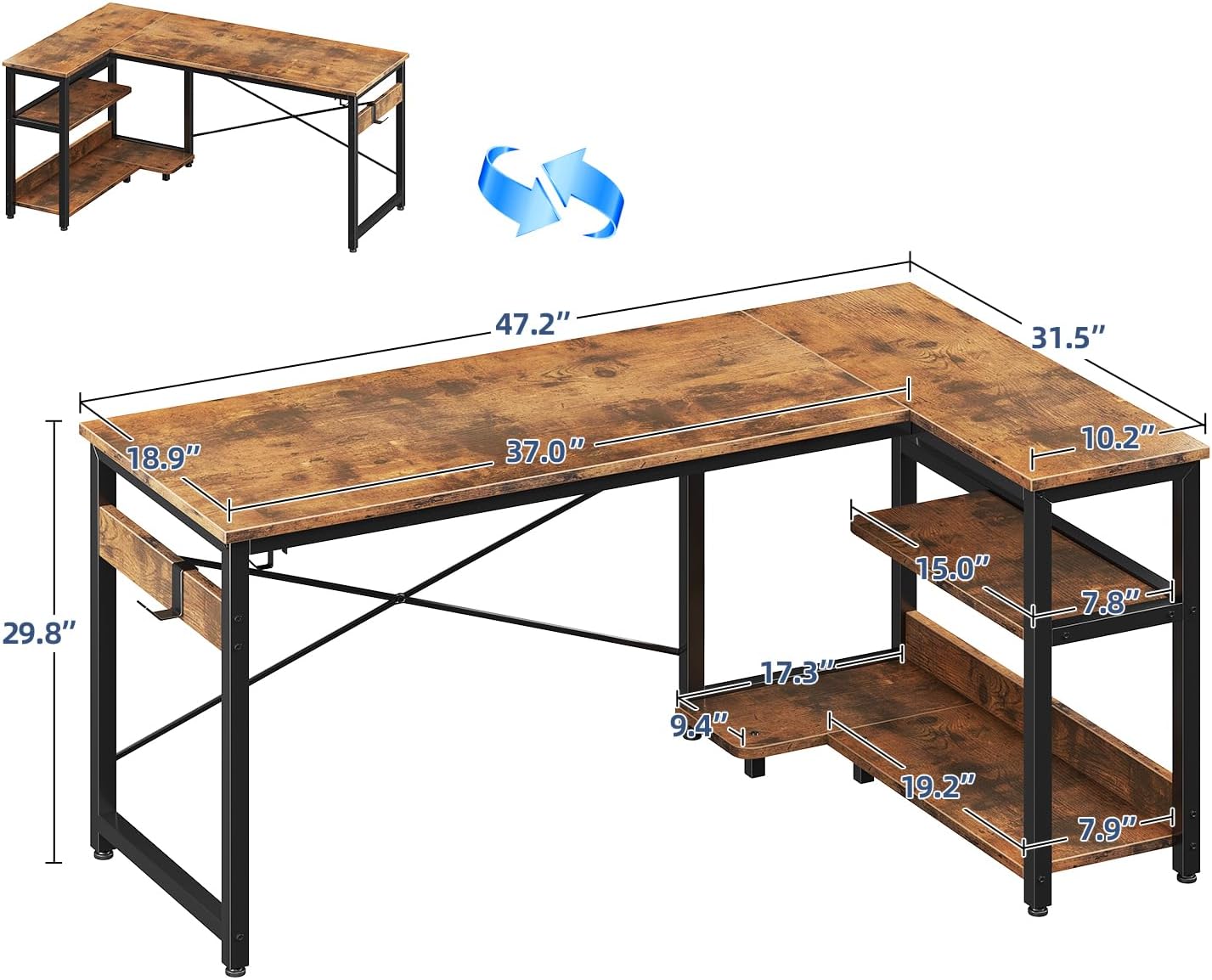 Casaottima L Shaped Computer Desk, 48 Inch Small Corner Desk with Storage Shelves & PC Stand, Reversible Gaming Desk for Bedroom, Modern Writing Study Table for Home Office, Vintage