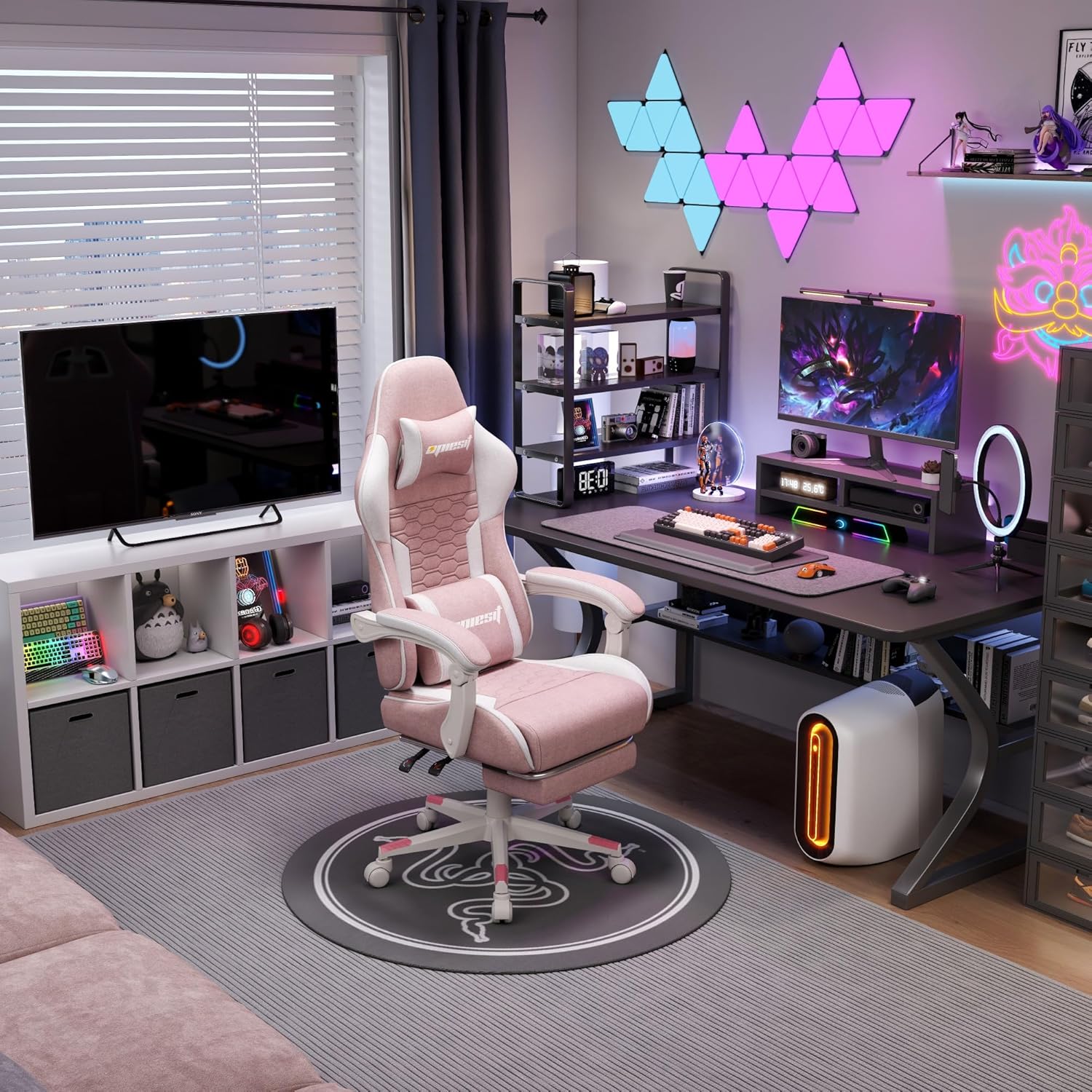 Gaming Chair, Computer Chairs for Adults with Lumbar Support and Massager, Comfortable Gamer Chair with Footrest & Pocket Spring Cushion, Ergonomic Home Office Chair, Pink, Fabric