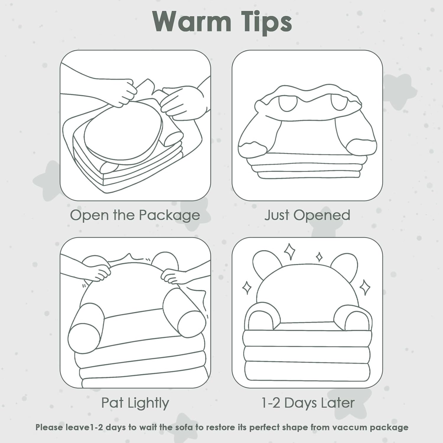 - [Warm Tips]: The toddler chair is vacuum-packed and pre-assembled. Due to vacuum packaging, there may be some wrinkles on the kids' sofa.Just open and wait 1-2 days for full shape.And you can pat and tidy slightly to speed up the rebound process.